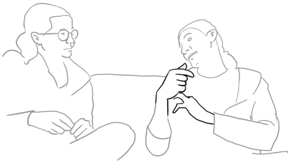 In a nutshell then, the negotiation of stances is done by a variety of instances of verbal and bodily resonance (Brône and Zima, 2014), the opponents repeat and thus reuse the same multimodal resources but change the course of action by coming to a different end and thus expressing a different stance. Since Paolo wanted to buy a house with her, it was clear to him that there was no need for an explicit marriage proposal. Elena, on the other hand, emphasizes that there was no explicit proposal and that her common sense was needed to understand the house purchase as an expression of the desire to enter into a life bond with her, which was only revealed to her between the lines.