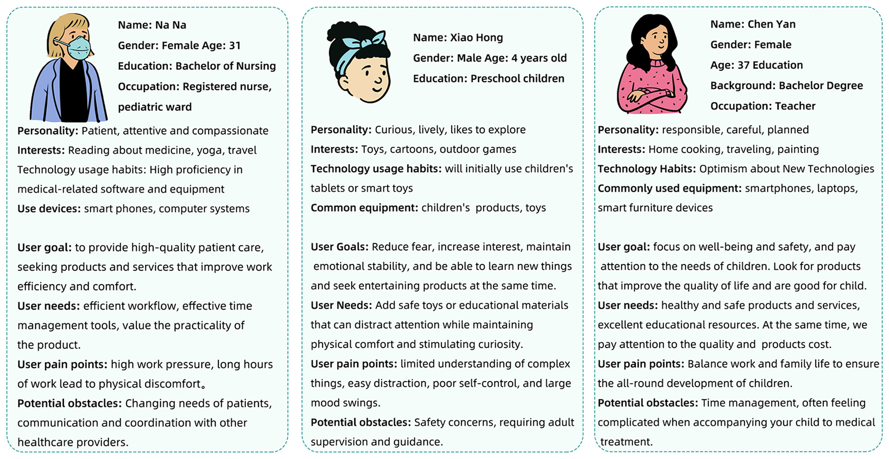 The literature review indicates that numerous studies have focused on children's attitudes toward products, their evaluations, and the integration of their needs in the design process. For example, Parbhu et al. (2019) explored the perceptions of children, parents/caregivers, and nurses regarding new and existing IV pole designs; Gennari et al. (2017) assessed the 8–10-year-olds' performance in game design through participatory play. Additionally, other studies have examined stakeholders and usage contexts in pediatric healthcare (Høiseth et al., 2014), as well as the connection between parents' habits and children's health (Eymirli et al., 2021).
