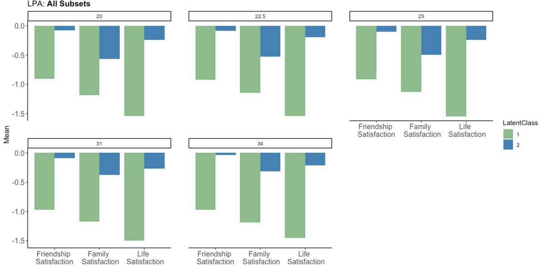 We argue that such an approach will address a substantive gap in relationship science. Previous research has investigated the longitudinal relationship between life satisfaction and marital satisfaction, differences in life satisfaction among married and unmarried people, and how the composition of a married person’s social network relates to their overall marital satisfaction (Birditt and Antonucci, 2007; DeMaris and Oates, 2022; Lawrence et al., 2019). These studies have furthered understanding of the dynamics between individual well-being, interpersonal relationships (outside of marriage), and marital satisfaction, but they do not explain how these variables work together. LPA methodologies are ideally suited for exploring complex combinations of multiple indicator variables by instantiating underlying patterns of variables in the form of groups (Spurk et al., 2020; Woo et al., 2018). It therefore allows researchers the ability to answer more nuanced questions. For example, can good relationships (i.e., with friends and family) buffer against an unsatisfying marriage? The present study sought to use LPA to address such questions through secondary analysis of a large preexisting dataset.