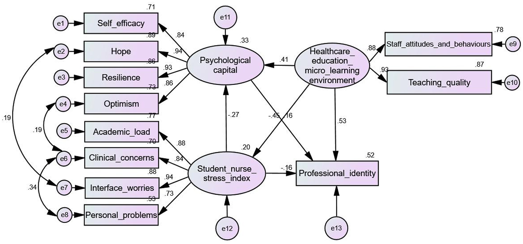 The mean total score for professional identity was 35.57 ± 7.47. Psychological capital positively influenced professional identity directly (β = 0.16, P < 0.01), while stress as measured using the student nurse stress index had a negative impact (β = −0.20, P < 0.01). High scores on the healthcare education micro-learning environment measure positively contributed to the development of professional identity (β = 0.69, P < 0.001). Furthermore, psychological capital was identified as a mediator in the association between the healthcare education micro learning environment and professional identity, as well as between the student nurse stress index scores and professional identity.