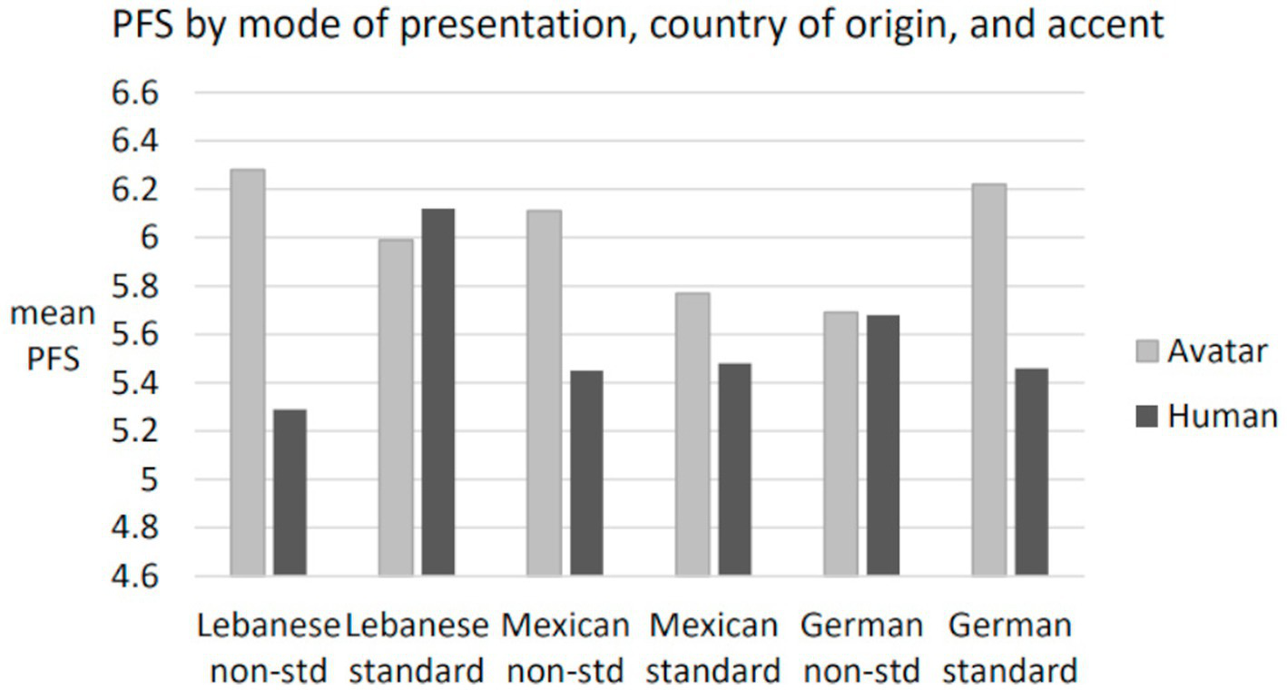 Perceived favorability score (PFS) by mode of presentation, country of origin, and accent.