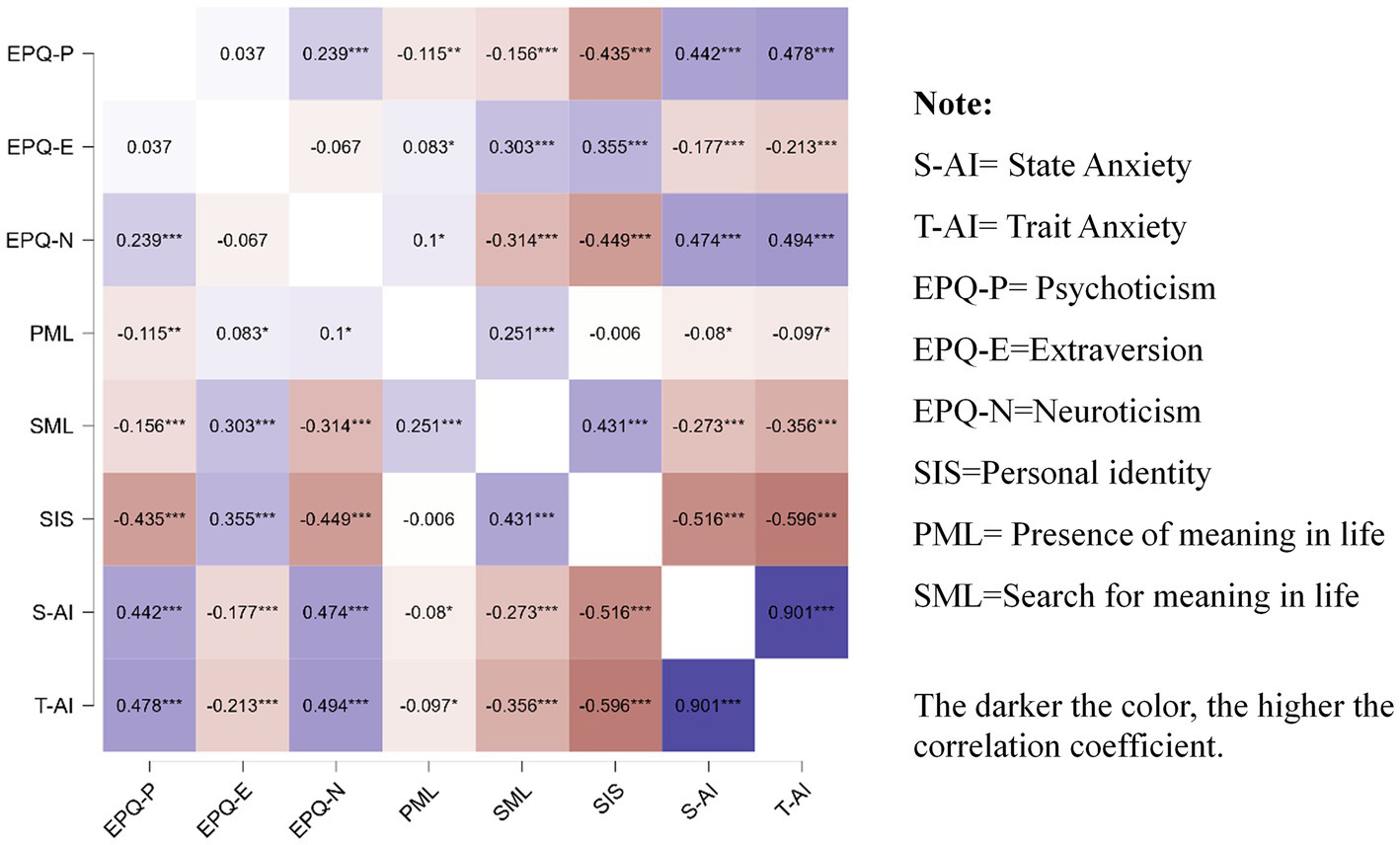 Pearson correlation coefficients were calculated to examine the relationships among personal identity, trait anxiety, personality traits, and meaning in life. A heatmap was generated to visualize the correlation matrix. The results showed that personal identity was significantly positively correlated with extraversion and the search for meaning in life, and significantly negatively correlated with state anxiety, trait anxiety, psychoticism, and neuroticism. State anxiety and trait anxiety were strongly positively correlated with each other. Both were significantly negatively correlated with extraversion, the search for meaning in life, and the presence of meaning in life, and positively correlated with psychoticism and neuroticism (see Figure 1).