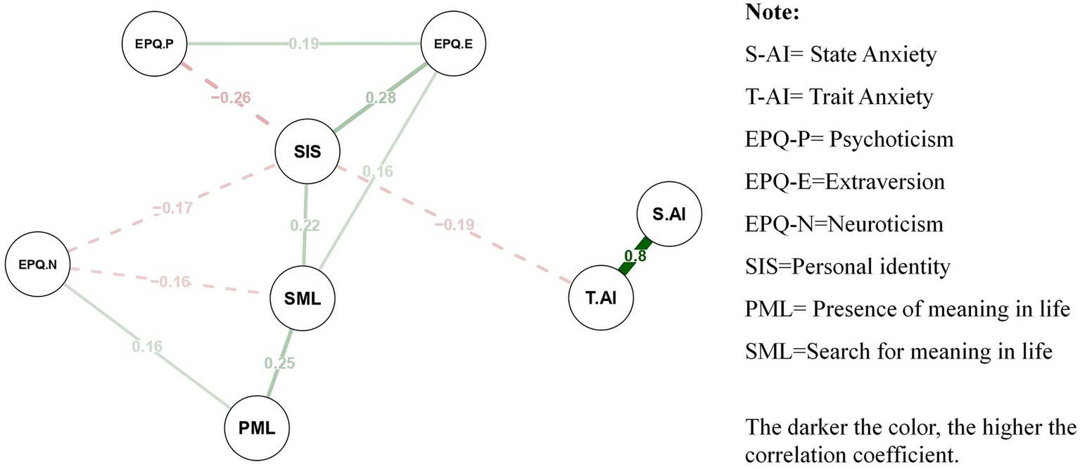 The hypothesis that personality would serve as a partial mediator between personal identity and trait anxiety was not supported by the results of this study. One possible explanation is that network analysis, unlike traditional regression-based mediation approaches, is designed to eliminate redundant paths and highlight the most direct associations between variables. As a result, the indirect effects observed in previous studies may not emerge as significant once overlapping influences are removed. However, it is worth noting that while the overall mediating effect of personality was not statistically significant, trait-level analysis still revealed meaningful trends. For example, neuroticism showed a strong positive correlation with trait anxiety, consistent with its established role in emotional vulnerability (McCrae and Costa, 1991). Conversely, extraversion was negatively associated with anxiety, suggesting a potential protective function. Psychoticism, although less studied in this context, was positively associated with identity instability and anxiety. These patterns, though not meeting mediation criteria in our model, point to the heterogeneous functions of individual traits and highlight the need for further research using dimensional or longitudinal approaches. This nuanced understanding aligns with recent personality–psychopathology frameworks that emphasize trait-specific pathways over generalized constructs (Kotov et al., 2010).