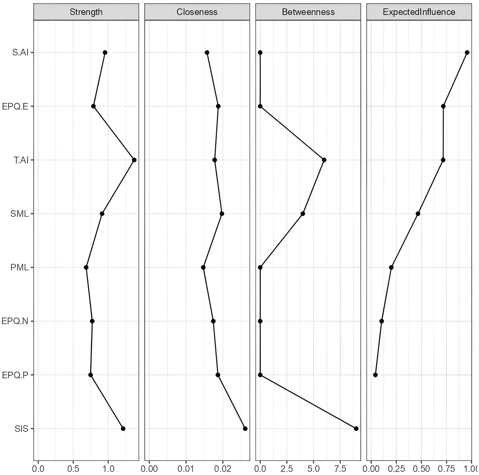 To further examine the factors affecting node predictability, this study calculated centrality indices, which measure the importance or centrality of nodes in a network. Specifically, strength, closeness centrality, and betweenness centrality were computed to evaluate the significance of each variable in the network (see Figure 3). The results show that SIS scores high on all three measures: strength, closeness centrality, and betweenness centrality (see Figure 3).