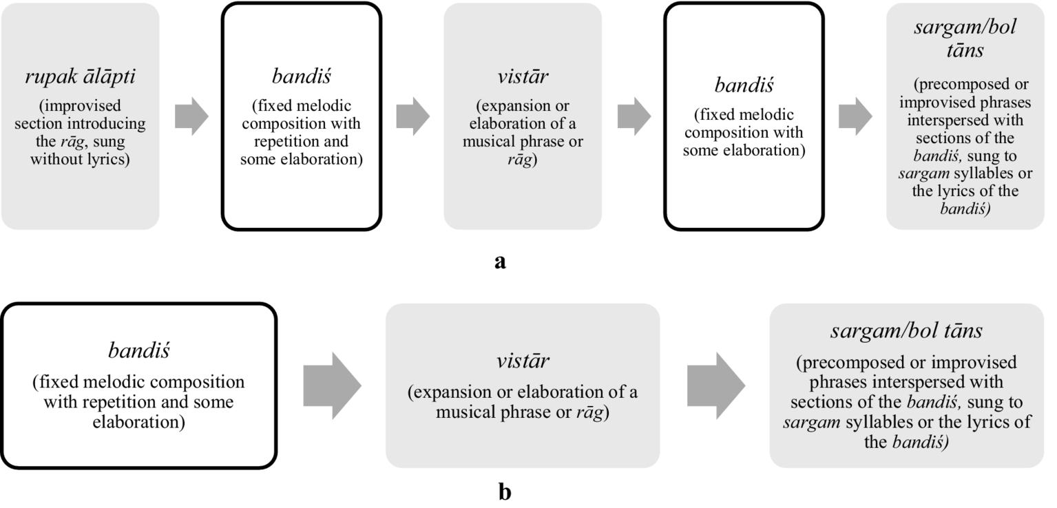 (a) The structure of a baṛā ḵẖayāl (long ḵẖayāl) in slow-medium tempo demonstrating the improvised sections in shaded boxes and fixed composition sections in bordered boxes. (b) The structure of a choṭā ḵẖayāl (short ḵẖayāl) which will often follow a baṛā ḵẖayāl in performance. The improvised sections are shown in shaded boxes and the fixed composition sections are shown in bordered boxes.