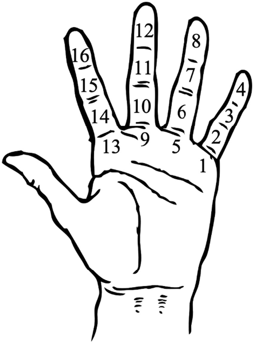 Diagram illustrating the areas of the left hand where each beat is signified with a tap from the left thumb.