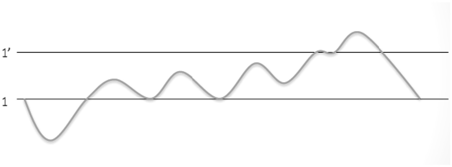 Modal nuclei are improvisatory objects which contribute to the constraints within which performers improvise. In the sequential phrases of the ālāp (the first section of a ḵẖayāl performance) pitches tend to lie within a specific range, developing according to a particular pattern. This strategy of using modal nuclei gradually reveals the rāg, ensuring that all features unique to the rāg are highlighted in the ālāp (Powers, 2001). Structuring the ālāp in terms of these pitch ranges also creates a teachable model for students. The ālāp progresses from the lowest to the highest register of a singer’s voice, with different scale degrees revealed sequentially. This progression is illustrated in Figure 3 in a diagram created by Widdess (2017), where the ‘sa’ of the middle octave and the ‘sa’ of the higher octave are represented by 1 and 1′.
