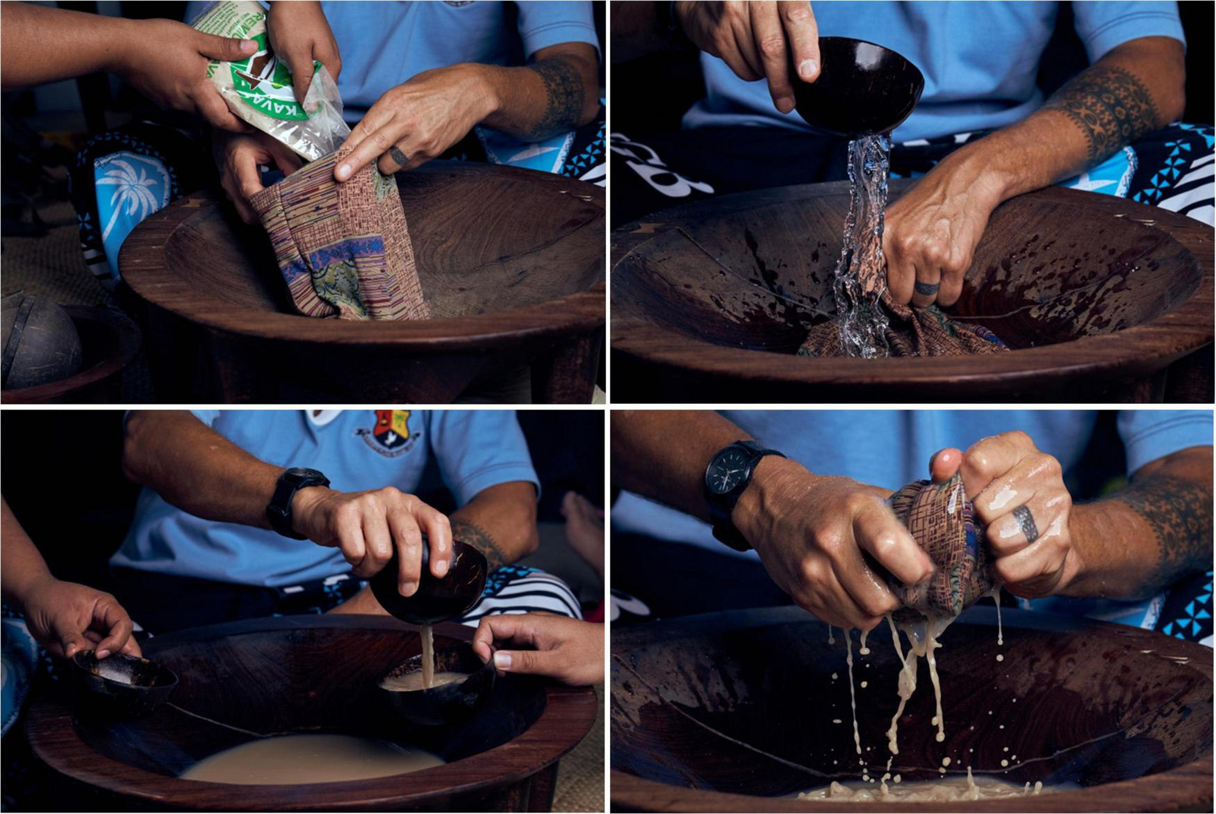 Figure 1. Kava mixing and serving in Tāmaki Makaurau Auckland, Aotearoa New Zealand. Clockwise: 1. dried and pounded kava powder is added to the silk mixing bag; 2. water is added to the tanoa or kumete (traditional kava bowl); 3. the kava (in the mixing bag) is washed through the water until the desired concentration is achieved; 4. the kava is served in ipu/bilo (cups made from half-coconut shells). Photographer: Todd M. Henry, 2019.