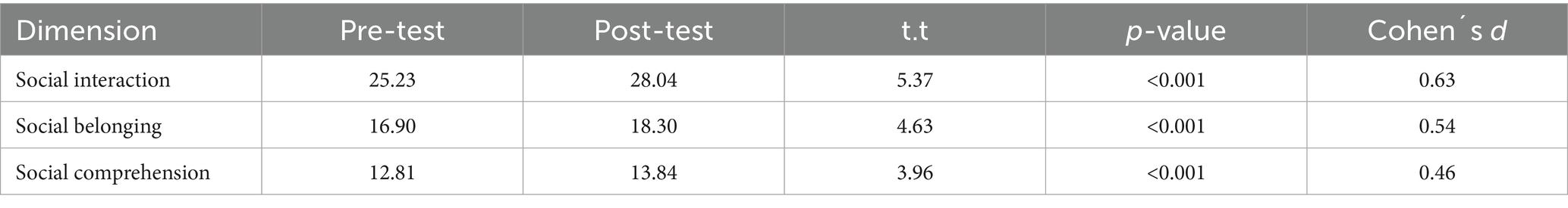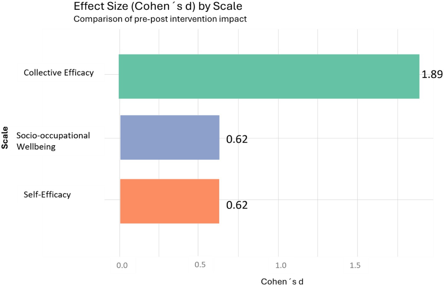 The findings derived from the effect size analysis indicate that the collective skills development intervention had a moderate to high impact on the dimensions that make up socio-occupational well-being. In particular, the socio-occupational interaction dimension showed the most pronounced effect (d ≈ 0.62), suggesting that the intervention favored the quality of labor relations, improving cooperation, effective communication, and mutual respect within teams. This result is in line with previous studies that highlight how interventions aimed at improving collective competencies, such as shared leadership, empathy, or coordination, have positive effects on interpersonal dynamics and group cohesion (Hakanen et al., 2021; Salanova and Llorens, 2016). On the other hand, the socio-occupational belonging dimension also showed a relevant effect size (d ≈ 0.54), indicating an improvement in the sense of inclusion, recognition, and subjective value of individuals within the work group. From the social well-being approach proposed by Keyes (1998), this dimension is central to the development of healthy environments, as it strengthens the emotional bond with the organization and promotes a positive collective identity. At the empirical level, recent studies indicate that when workers feel that they are an active and valued part of their team, levels of psychological well-being, engagement, and organizational commitment increase (Huertas-Valdivia et al., 2023).