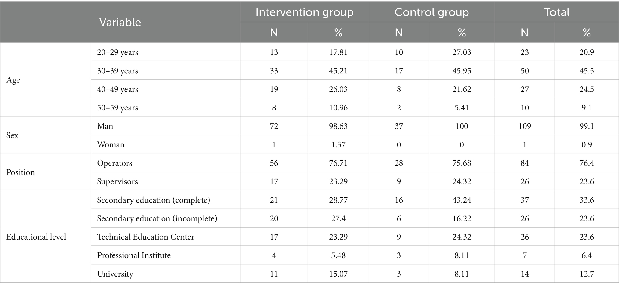 The sample comprised a total of 110 workers employed by a mining company that extracts copper and gold in the Coquimbo Region. The subjects belong to two groups: an intervention or quasi-experimental group (n = 73) and a control group (n = 37), both composed of Plant Operators and Supervisors belonging to the Grinding, Crushing, and Flotation units of the Operations division. Their ages range from 24 to 57 years, with an average of 36.7 (SD = 9). Table 1 specifies other demographic data and their distribution.