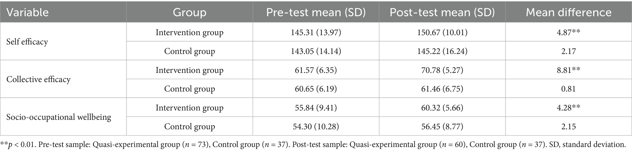 In summary, the three constructs under study and their associated dimensions show significant improvements post-intervention in the quasi-experimental group with a high level of statistical significance p < 0.001. Social interaction showed the greatest effect, reflecting the strengthening of work relationships and a greater willingness to collaborate. These findings allow us to conclude that the intervention has an impact at both the individual and group levels, mobilizing collective competencies that are key to effective performance in work contexts. The results shown confirm the fourth and final hypothesis (H4) of the study. The intervention has a positive effect in each of the variables in study Self-Efficacy, Collective Efficacy and Socio-occupational Wellbeing (Table 8 and Figure 1) and its dimensions.