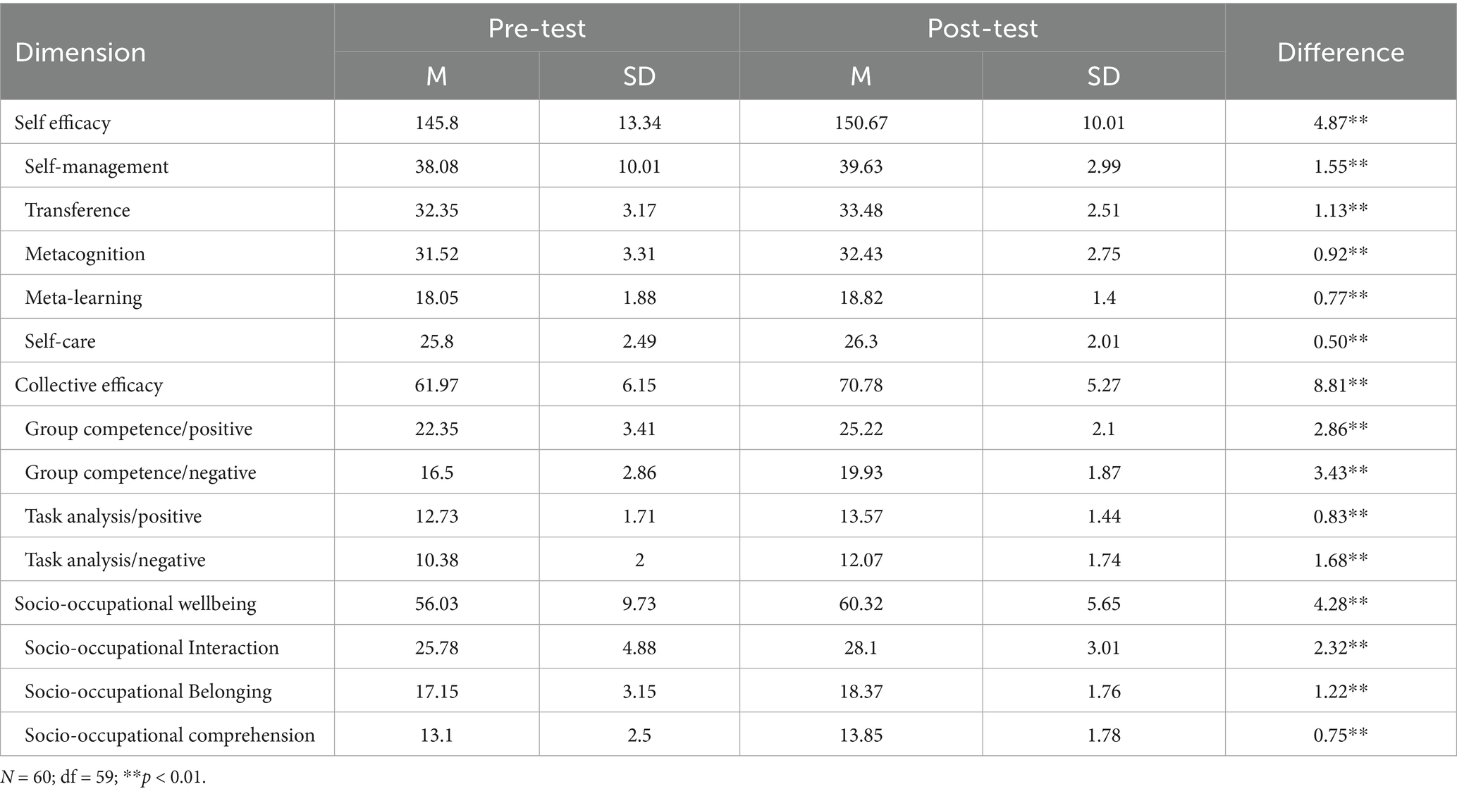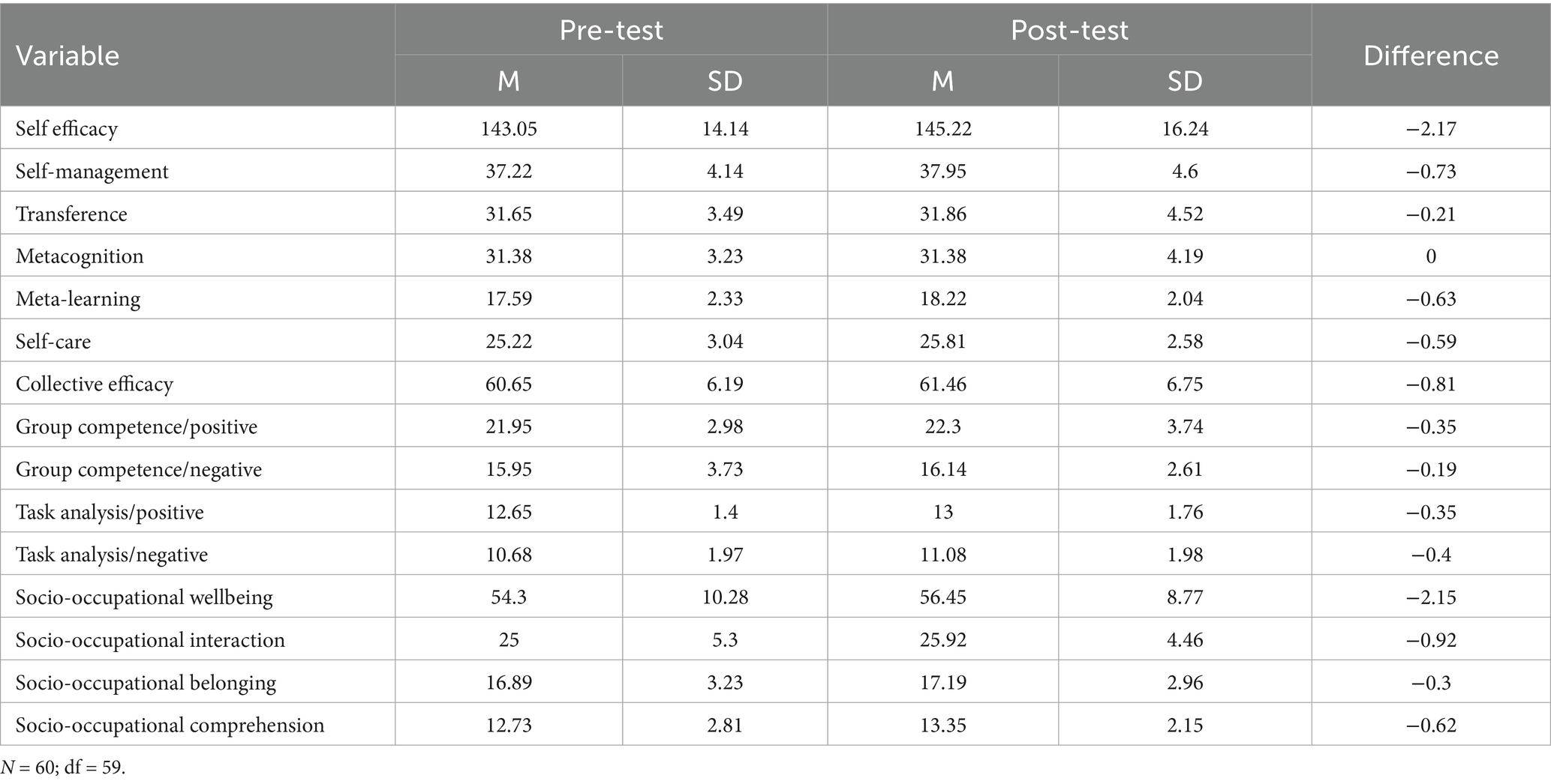 The results show that the collective skills development intervention had a significant impact on various dimensions of self-efficacy, particularly self-management, with an effect size greater than d = 0.65. This finding reflects a strengthening of individuals’ ability to regulate their behavior, set goals, manage their emotions, and maintain their motivation in the face of work challenges. From the perspective of Bandura’s (2000) Social Cognitive Theory, self-management represents a central component of human agency, and its strengthening acts as a catalyst for self-regulation and autonomous performance. Furthermore, in the organizational context, self-management is related to the ability of workers to contribute actively and healthily to teamwork, reducing friction and promoting collaborative dynamics (Salanova and Llorens, 2016).