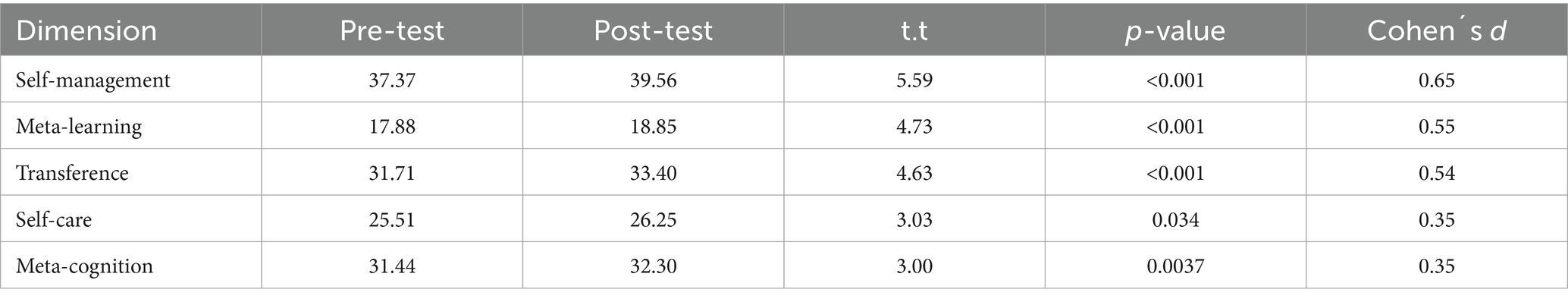 Self-management achieved the largest effect size (d = 0.65), suggesting that it was the dimension most impacted by the intervention, reflecting significant progress in planning, self-regulation, and work performance organization skills. This was followed by Meta-learning (d = 0.55) and Transfer (d = 0.54), both dimensions associated with autonomous learning and the flexible application of knowledge (Table 5). Finally, Self-Care and Metacognition (both with d = 0.35) also showed significant improvements, although with moderate effects. These results confirm that the intervention was effective in strengthening individual competencies associated with Personal Effectiveness.