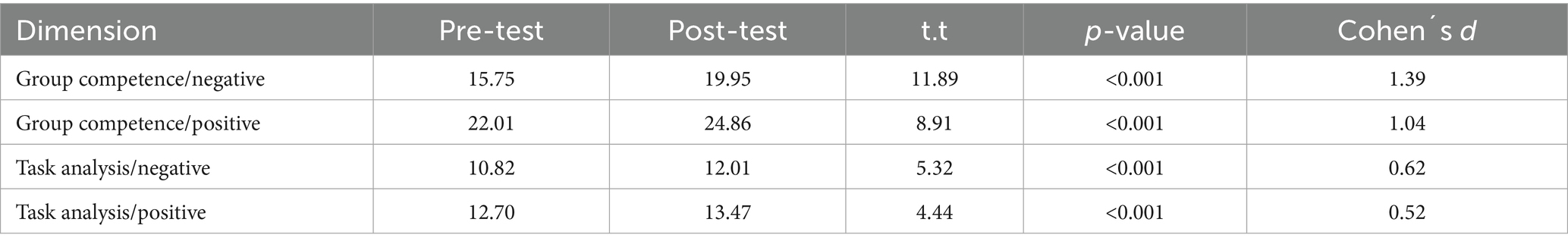 With regard to the Collective Efficacy Scale, the results show a significant impact of the intervention in all its dimensions, with moderate and very large effect sizes (Table 6). The greatest variations were observed in the dimension of negative group competencies (CG−), which showed a large effect size (d = 1.39), suggesting a significant decrease in dysfunctional perceptions in collective work. This improvement could be associated with greater awareness of the factors that hinder collaboration within the team.