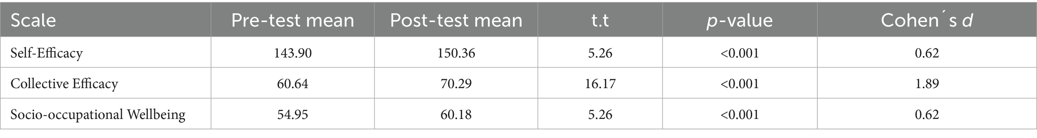 To evaluate the impact of the intervention on each dimension of the constructs under study: Self Efficacy, Collective Efficacy, and Socio-Labor Well-being, was performed paired t-tests and calculating the effect size (Cohen’s d), a pre-post analysis of the quasi-experimental group, following the technical and practical recommendations of the recent guide on effect sizes and their confidence intervals (Jane, 2024). A significance level of p ≤ 0.05 was adopted, a criterion commonly accepted in the social sciences to determine whether the observed changes are statistically significant (White et al., 2022).