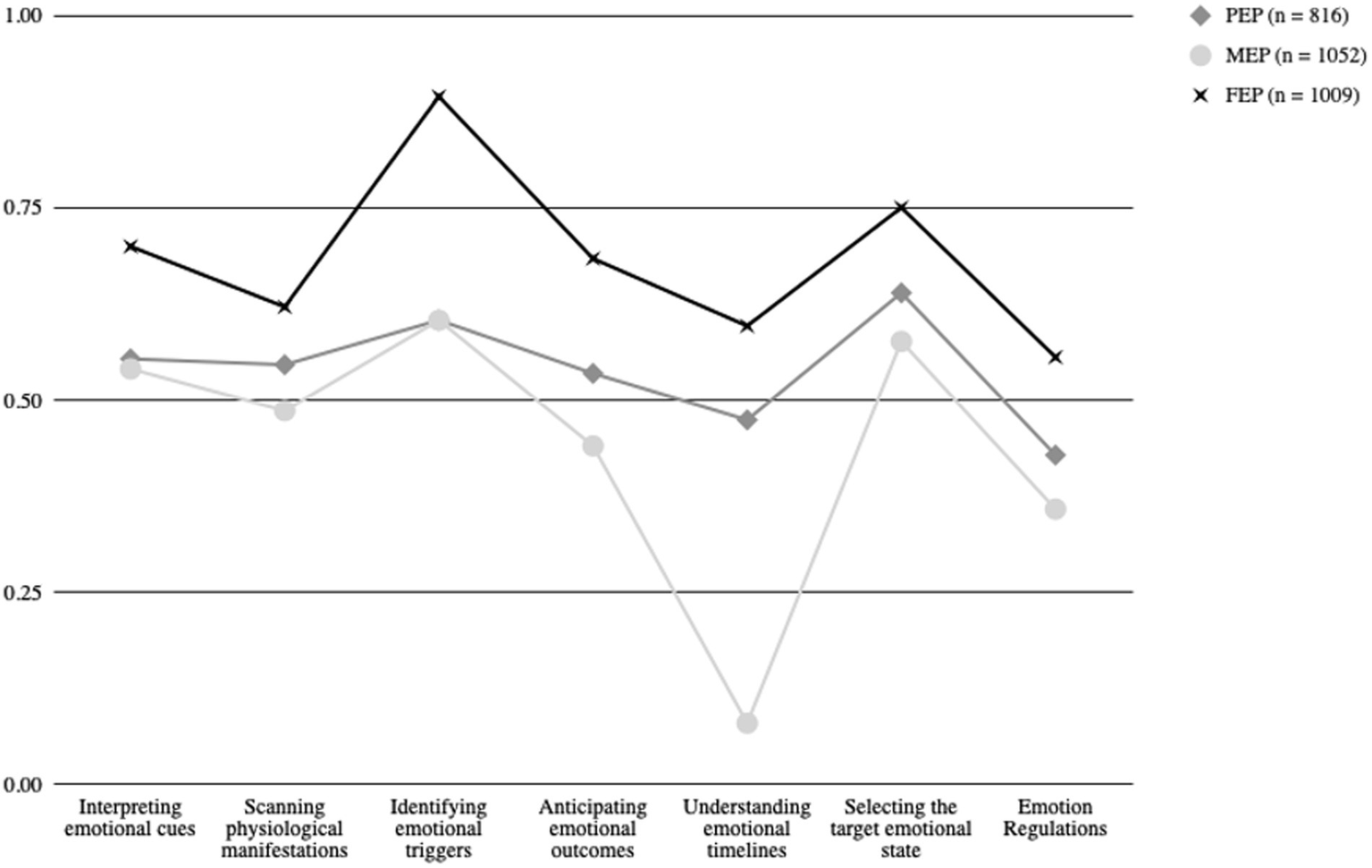 We named the three profiles full emotional processing (FEP), minimal emotional processing (MEP), and partial emotional processing (PEP). The FEP outperforms the two other profiles on all EI abilities measured by QEg (the subscales appear in Figure 1). These results suggest that the FEP profile captures and processes emotional information in a broader and deeper way than the two other profiles (Scanning Physiological Manifestations, Interpreting Emotional Cues, Identifying Emotional Triggers, Understanding Emotional Timelines, Anticipating Emotional Outcomes, Selecting the Target Emotional State, and Emotion Regulation).