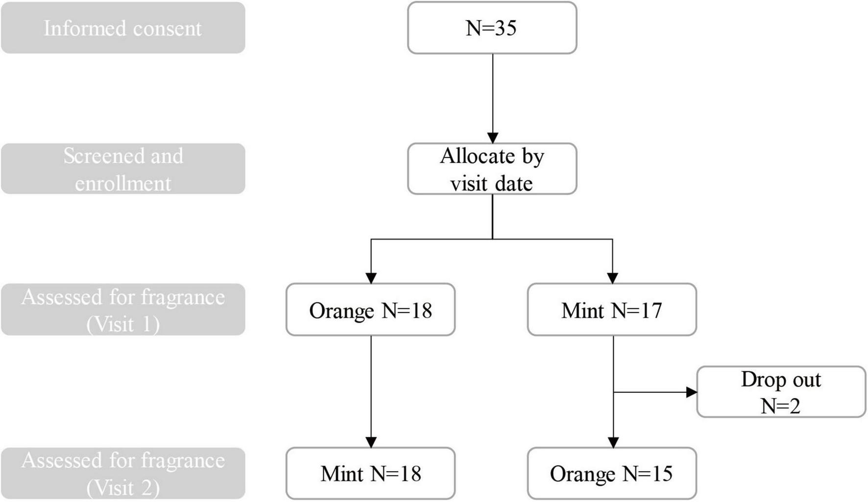 A total of 35 participants within the age range of 23–55 were enrolled in the study, of whom 33 completed the experiment, including 21 females and 12 males. Before their sessions, participants underwent screening to ensure the absence of allergies, and airway congestion (due to cold/flu) and were instructed to refrain from consuming alcoholic beverages, coffee, tea, cigarettes, sleeping pills, or any other substances that could impact their mental state within 24 h of the session. Additionally, they were advised to avoid using strongly scented products. In the screening process, to ensure that the participants have normal olfactory function and to exclude individuals who reject the test fragrance, the participants were asked to evaluate four different essential oil perfumes and classify them into likes, dislikes, or neutral according to their personal preferences. Two of these perfumes, orange and mint, are used for official testing. All participants were of Chinese descent and were recruited locally. Ethical approval for this study was obtained from the Shanghai Clinical Research Ethics Committee, adhering to the principles of the Helsinki Declaration. Informed consent was obtained from all participants, and they were compensated appropriately upon completion of the experiment.