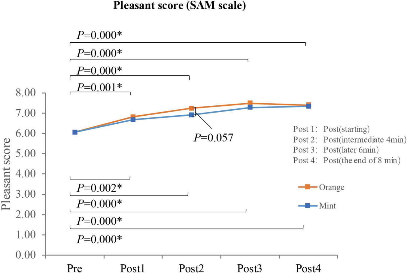 Figure 3. The pleasure ratings of participants (N = 33) at different stages before and after smelling the fragrance. *p < 0.05.