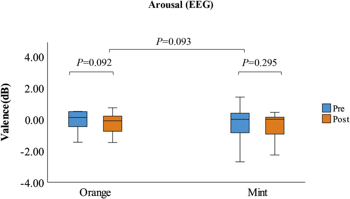 Figure 5. The box plot shows the arousal measured by EEG before and after smelling the fragrance (N = 28).