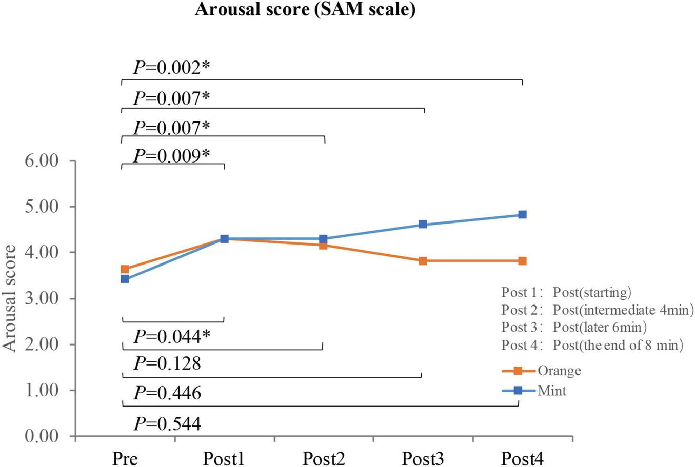 Figure 6. The arousal ratings of participants (N = 33) at different stages before and after smelling the fragrance. *p < 0.05.