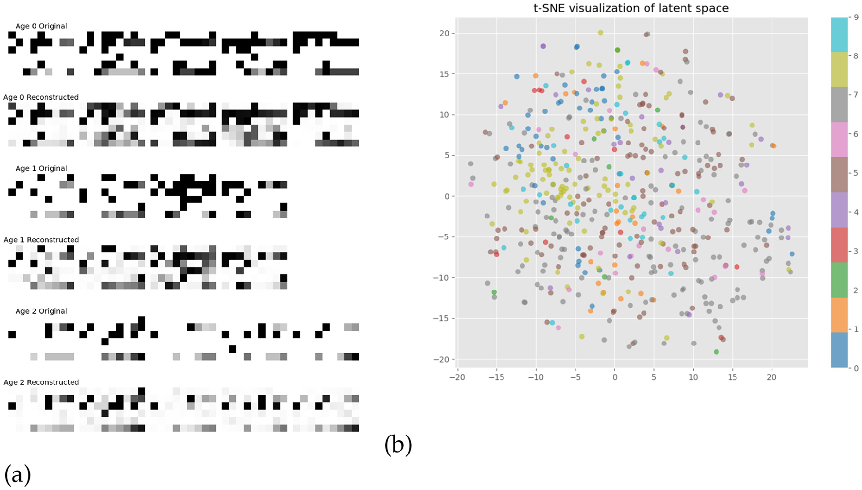 The CGMVAE architecture achieved an optimal performance after 15 epochs with a validation loss equal to 1.516. The encoder architecture comprised a fully connected layer followed by ReLU activation and batch normalization, branching into separate networks for computing mixture components q(y|x), means (μ), and log-variances (logσ2). The decoder reconstructed the input features through a mirror architecture, maintaining the same hidden dimension while incorporating the conditional information. The winner parameters showed an encoder hidden layer of 201 units feeding into a latent space of 58 dimensions, structured as a mixture of 10 Gaussian components. Training employed the Adam optimizer with a learning rate of 9.68 × 10−4 and a weight decay of 4.00 × 10−5, with the variational objective tuned via a β of 0.051 and a free bits threshold of 0.048. Gradient clipping at 0.644 further ensured stable parameter updates during training. Figures 4a, b showed graphically the reconstruction error by binned ages and the latent space of the two dimensions by applying the t-SNE visualization analysis (van der Maaten and Hinton, 2008). As depicted in Figure 4a, the reconstruction error analysis demonstrates the model's capability to preserve essential data features across all age bins, with reconstructed samples closely matching their original counterparts. However, subtle variations in reconstruction quality are observed across the age spectrum, suggesting age-specific patterns in data complexity and representational characteristics.