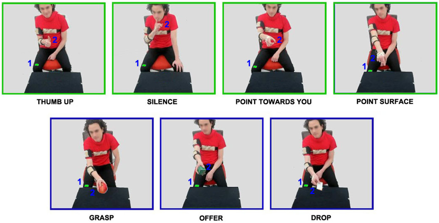 Two theater actors (1 male, 1 female) were asked to perform with their dominant right hand seven different actions (ethical committee approval of Liguria Region, n.222REG2015). Specifically, three actions were performed with objects (grasping; offering; dropping a game card) and four actions were performed without objects (indicating a point of the surface; thumbing up; rising a finger to the mouth in a silence gesture; pointing toward the other person, Figure 1). All these actions were performed in a social context: toward another person (the experimenter) sitting in front of the actor, who did not perform any specific movement.