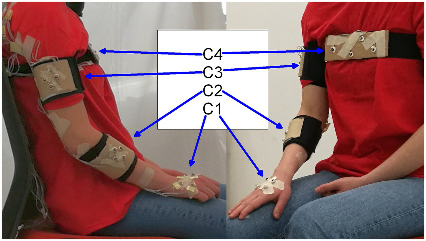 The multimodal data were recorded using the NDI Optotrack Certus system, and 2 webcams (one frontal and one lateral). The motion capture system (3D positional data, at 100fps) and the video recording (1920 × 1,080 at 30fps) were synchronized using YARP platform. The synchronized data playback was realized with the freely available EyesWeb software (Volpe et al., 2016). During the execution of each action, the 3D positions of 16 markers were recorded. Specifically, markers were assembled into four rigid bodies placed close to the wrist, elbow, shoulder, and on the torso of each actor (Figure 2). Two additional markers were used to refer to the table placed in front of the actor.