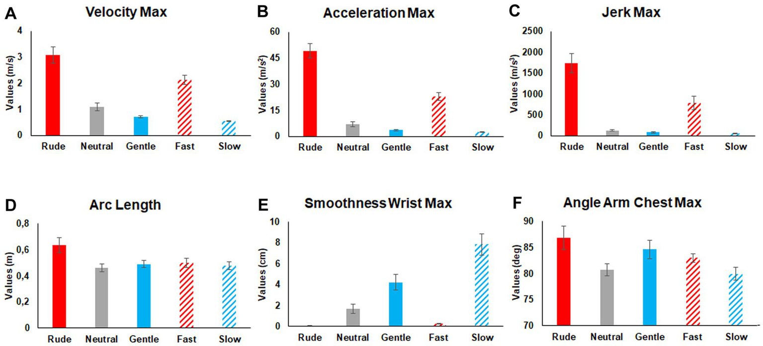 Figure 3. Mean values of the most representative kinematic features characterizing all the actions performed in five different ways (rude, neutral, gentle, fast, slow). Comparison among conditions and related significance values are reported in Table 2.