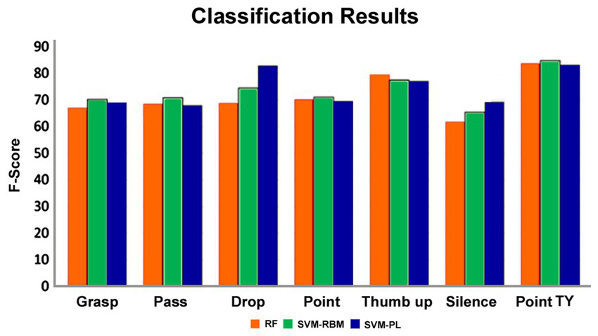 Figure 4. The F-scores related to each type of action when using leave-one-gesture-type-out method and RF, SVM-RBM, and SVM-PL.