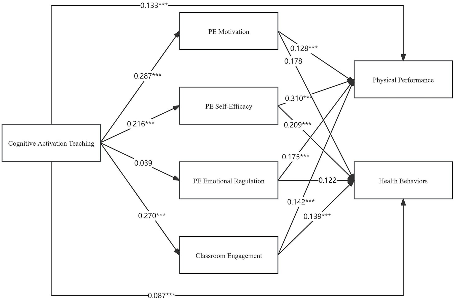 Cognitive activation teaching strategies can enhance physical performance and health behaviors in primary school PE classes by focusing on the roles of motivation, emotional regulation, and self-efficacy. The integration of multi-teaching styles and active reflection (MTA) has been shown to significantly improve fitness levels, motor competence, enjoyment, and the amount of physical activity among students (Invernizzi et al., 2019). Furthermore, a systematic review indicates that quality-based PE interventions are associated with improvements in health-related physical fitness and fundamental motor skills (FMS) (García-Hermoso et al., 2020). These findings underscore the importance of adopting diverse and engaging teaching methods to achieve positive learning outcomes in physical education. Based on this, hypothesis 1 and hypothesis 2 are proposed:
