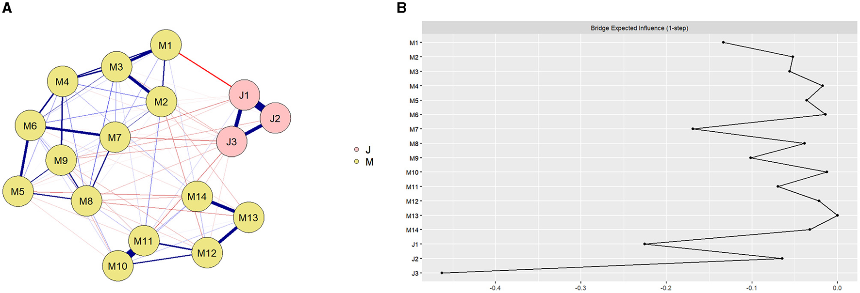 (A) Network structure of preschool teachers' teaching mindfulness and teacher burnout. Preschool teachers' teaching mindfulness (M1: Non-automated instruction, M2: Concentrate on the present moment, M3: Concentrate on teaching, M4: Focus on process, M5: Attention to experiences along the way, M6: Whole-body teaching, M7: Appropriate expression of pain, M8: Listening to young children's expressions, M9: Overcoming teaching difficulties, M10: Allowing young children to express themselves, M11: Listening to young children's opposing views, M12: Emotions affect young children, M13: Think twice before you act, M14: Calmly dealing with young children); and teacher burnout (J1: Emotional exhaustion, J2: Depersonalization, J3: Low achievement), with the blue line indicating a positive correlation and the red line indicating a negative correlation; the thicker the line and the more saturated the color, the stronger the correlation. See Appendix 11 for details. (B) The values of the bridge expected influence for each node in the network. Teaching mindfulness (M1: Non-automated instruction, M2: Concentrate on the present moment, M3: Concentrate on teaching, M4: Focus on process, M5: Attention to experiences along the way, M6: Whole-body teaching, M7: Appropriate expression of pain, M8: Listening to young children's expressions, M9: Overcoming teaching difficulties, M10: Allowing young children to express themselves, M11: Listening to young children's opposing views, M12: Emotions affect young children, M13: Think twice before you act, M14: Calmly dealing with young children), and teacher burnout (J1: Emotional exhaustion, J2: Depersonalization, J3: Low achievement). See Appendix 12 for details.