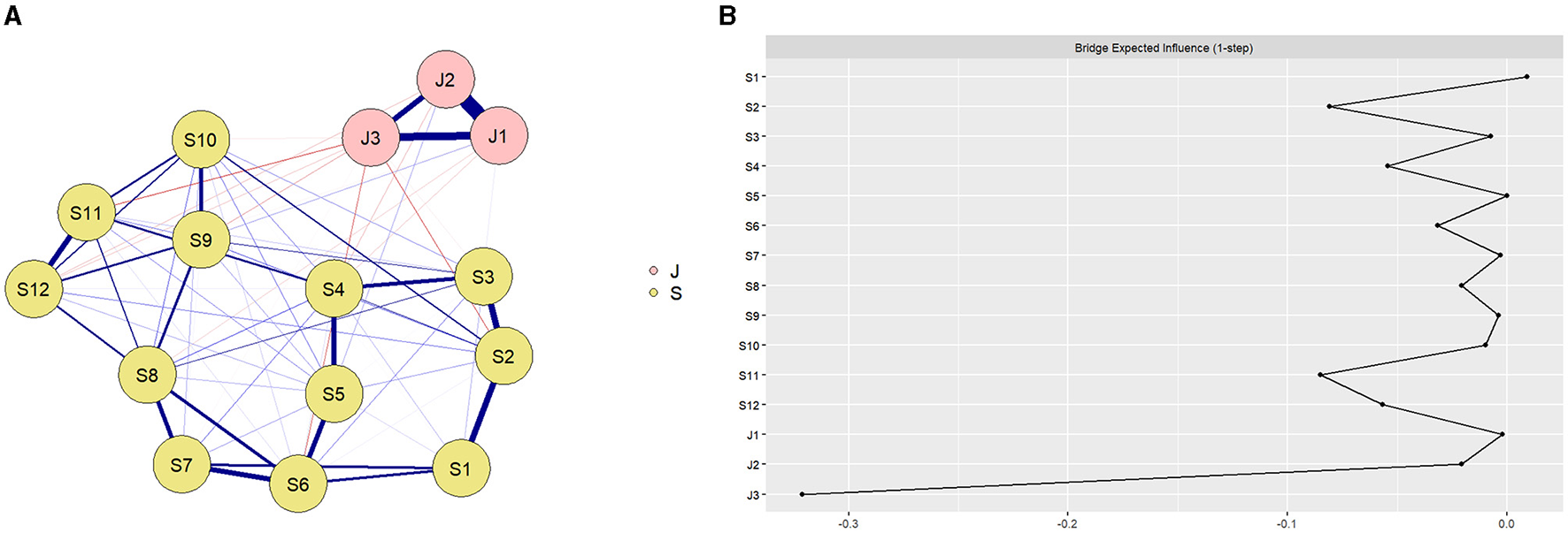 (A) Network structure of preschool teachers' self-efficacy and teacher burnout. Preschool teachers' self-efficacy (S1: Stopping young children's disruptive behavior, S2: Encouraging young children to love learning, S3: Getting young children to do well in school, S4: Engaging young children to value learning, S5: Ask good questions of young children in the classroom, S6: Getting children to follow classroom discipline, S7: Keeping disruptive toddlers quiet, S8: Establishing effective classroom management models, S9: Evaluating young children from multiple perspectives, S10: Multiple explanations to help young children understand, S11: Home-school cooperation to help young children, S12: Use multiple instructional strategies in the classroom); and teacher burnout (J1: Emotional exhaustion, J2: Depersonalization, J3: Low achievement), with the blue line indicating a positive correlation and the red line indicating a negative correlation; the thicker the line and the more saturated the color, the stronger the correlation. See Appendix 13 for details. (B) The values of the bridge expected influence for each node in the network. Teacher self-efficacy (S1: Stopping young children's disruptive behavior, S2: Encouraging young children to love learning, S3: Getting young children to do well in school, S4: Engaging young children to value learning, S5: Ask good questions of young children in the classroom, S6: Getting children to follow classroom discipline, S7: Keeping disruptive toddlers quiet, S8: Establishing effective classroom management models, S9: Evaluating young children from multiple perspectives, S10: Multiple explanations to help young children understand, S11: Home-school cooperation to help young children, S12: Use multiple instructional strategies in the classroom); and teacher burnout (J1: Emotional exhaustion, J2: Depersonalization, J3: Low achievement). See Appendix 14 for details.