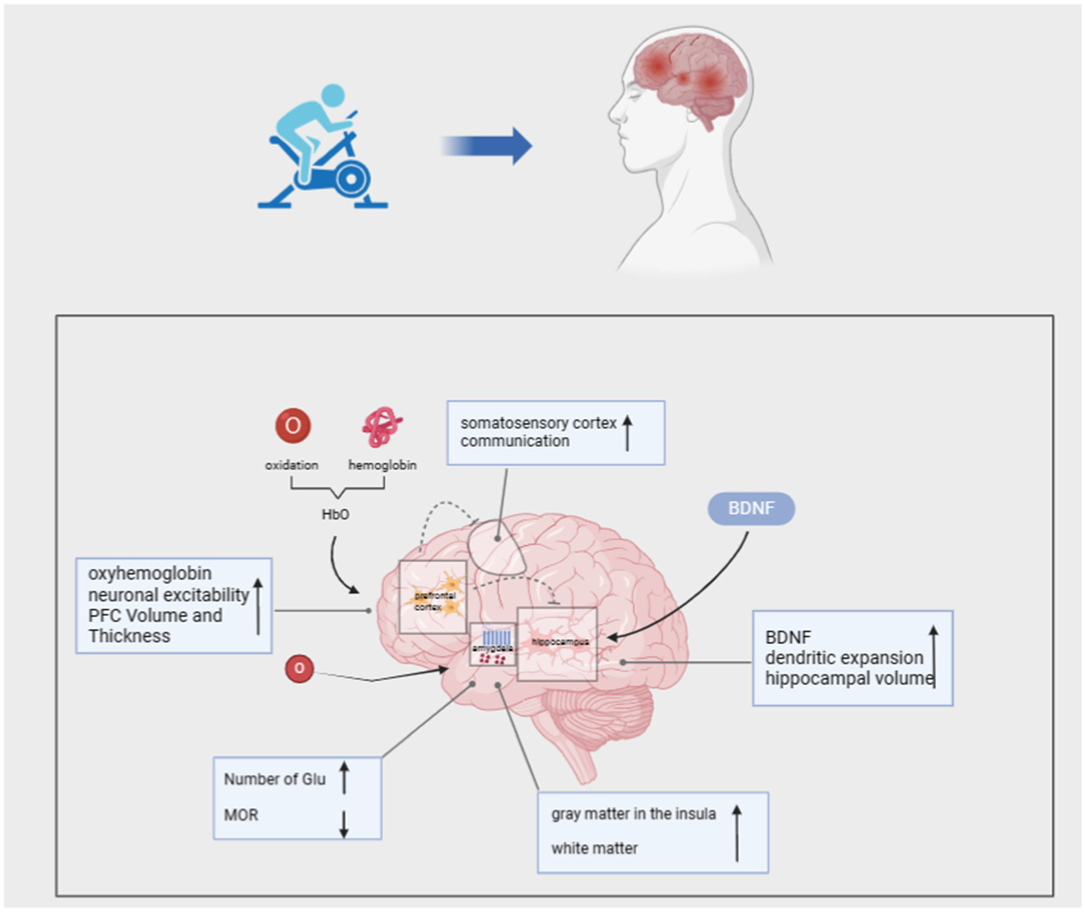 Numerous studies have demonstrated that aerobic exercise enhances PFC activity. Loprinzi et al. conducted a study wherein a walking intervention was administered to patients with PTSD. They observed that moderate-intensity walking increased PFC activity, leading to elevated levels of oxygenated hemoglobin (HbO) in the left PLPFC post-exercise (Loprinzi et al., 2022). Oxygenated hemoglobin (HbO) delivers oxygen to neuronal tissues, promoting neuronal activity and enhancing communication between the PFC, somatosensory cortex (SMC), and hippocampus. This process effectively enhances the patient’s memory capacity and facilitates memory formation and retrieval. Research indicates that a 3-month muscle strength training and aerobic exercise intervention, particularly high-intensity aerobic exercise, can augment prefrontal lobe (PFC) volume and thickness in PTSD patients, resulting in cognitive and neurological improvement effects (Soshi et al., 2021). Furthermore, during exercise, muscle activation and the activation of muscle spindle waves trigger action potentials that propagate to the spine and brainstem, ultimately enhancing neuronal excitability in various memory-related brain structures (Gao et al., 2022).