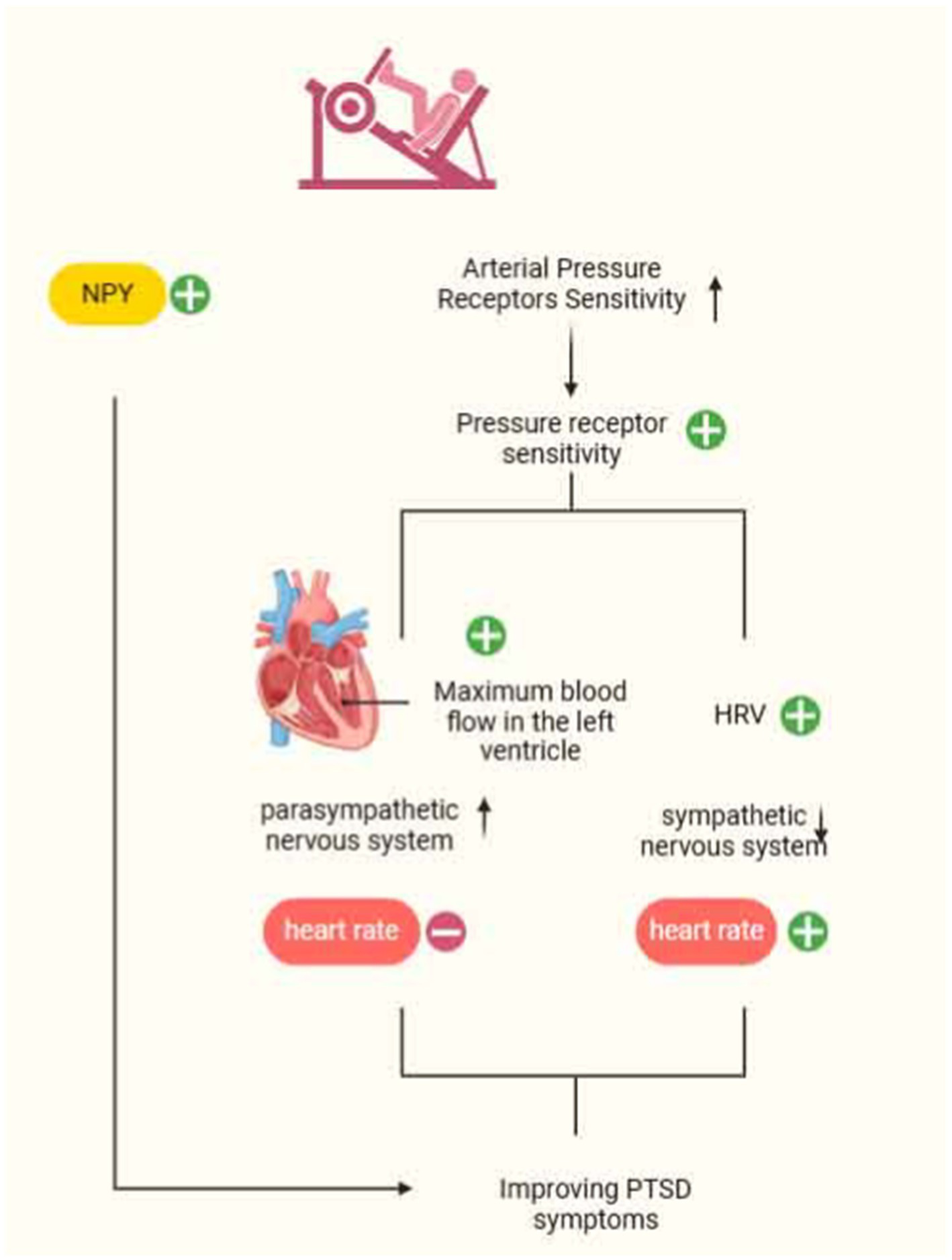 The autonomic nervous system (ANS) comprises sympathetic and parasympathetic nerves, with neuropeptide Y (NPY) serving as a sympathetic neurotransmitter primarily found in the periphery. NPY is involved in regulating stress responses in individuals. High activation of sympathetic nerves leads to the release of large amounts of NPY, resulting in increased blood pressure, inhibition of the vagus nerve, and the maintenance of energy balance. Studies have demonstrated decreased resting plasma NPY levels in veterans with PTSD, which diminishes their anxiolytic effects (Rämson et al., 2011; Scioli et al., 2020). To harness the function of NPY and alleviate PTSD symptoms, Rämson investigated the use of exercise training to enhance NPY function. Maximum-load exercise was identified as a potential mediator of PTSD symptom improvement in a study involving 90 veterans who underwent 3 months of progressive aerobic exercise. In addition, resistance training also has an effect on NPY release, enhancing NPY synthesis under stress conditions and increasing anxiolysis levels to ameliorate PTSD symptoms (Levine et al., 2014). Paradoxically, chronic stress-induced over-activation of the negative feedback regulation of NPY and the “exercise-NPY” production mechanism can lead to excessive NPY release into adipose tissue, resulting in obesity and metabolic syndrome (Levine et al., 2014). Thus, the challenge lies in enhancing anxiolysis levels while mitigating related comorbidities, a topic that warrants further investigation in subsequent studies.