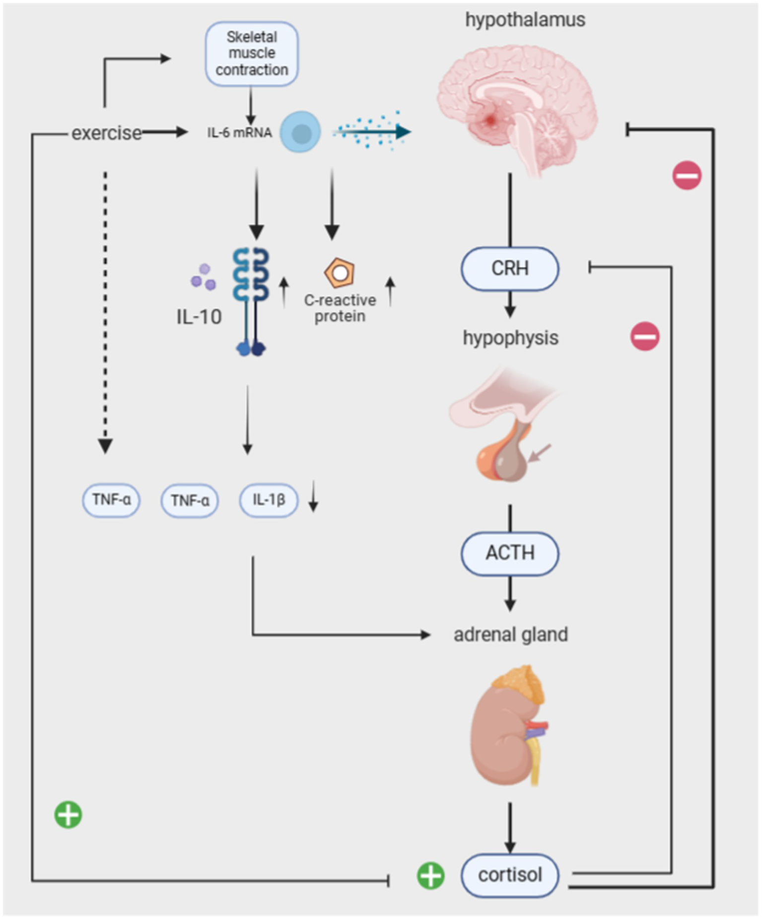 The central nervous system (CNS) and the sympathetic nervous system (SNS) interactively maintain the body’s adaptive physiological functions. The hypothalamic–pituitary–adrenal axis (HPA), the body’s major stress system, interacts with the SNS. The hypothalamus secretes corticotropin-releasing hormone (CRH), stimulating the pituitary gland to release adrenocorticotropic hormone (ACTH). ACTH stimulates the adrenal glands to release cortisol, which in turn acts on the hypothalamus and pituitary gland, providing negative feedback to regulate the system. According to the cross-stressor adaptation hypothesis, exercise training enhances the physiological stress response system’s adaptation, promoting cross-stressor tolerance. It even reduces sensitivity to non-exercise stressors (Kelly et al., 2018).