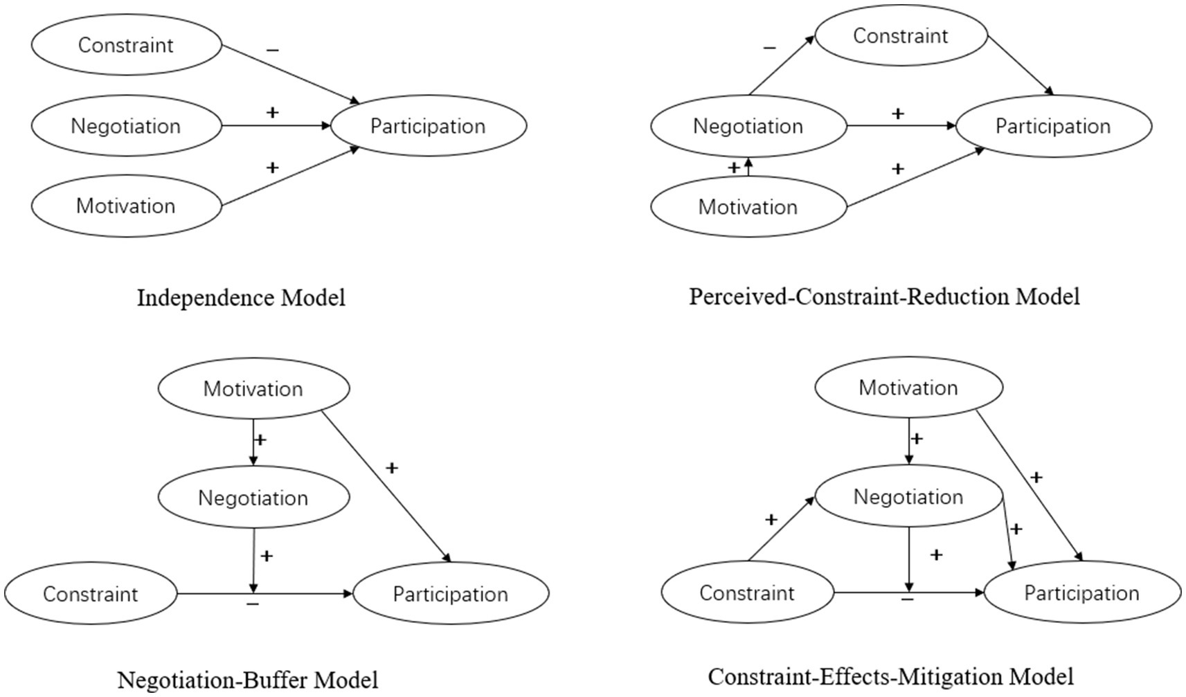 Leisure constraints are believed to inhibit participation in activities or limit satisfaction, and obstacles inevitably lead to nonparticipation. However, as in-depth research on leisure has shown that constraints are not insurmountable, Jackson et al. (1993) synthesized existing research, suggested a series of propositions to outline the negotiation process of constraints and proposed the core idea that leisure participation does not depend on the absence of constraints but on the implementation of flexibility through negotiation, which is evident in the fact that when people recognize the fact that they have encountered constraints, certain strategies to overcome them may be proposed to assess, adapt, mitigate or eliminate those constraints. For example, Scott (1991) found that bridge players overcome time constraints, manage schedules, and develop new operational skills when given the opportunity to participate. Kay and Jackson (1991) found that when people engaging in leisure activities face financial constraints, they look for more affordable ways to participate; when faced with time constraints, the time and work they spend on housework are reduced. With regard to constraints, Jackson and Rucks (1995) pioneered the idea of generalizing alternative strategies into cognitive and behavioral strategies, specifically identifying time management, skill acquisition, changing relationships, improving finances, and changing leisure desires. Hubbard and Mannell (2001) extended the scope of leisure theory and tested four competing models using validation factor analysis and structural equation models, including independent models, workaround-buffer models, limit-effects buffer models and perception-constraint-reduction models, each of which contains a structure consisting of leisure motivation, leisure constraints, adaptation, and leisure participation, as shown in Figure 1.