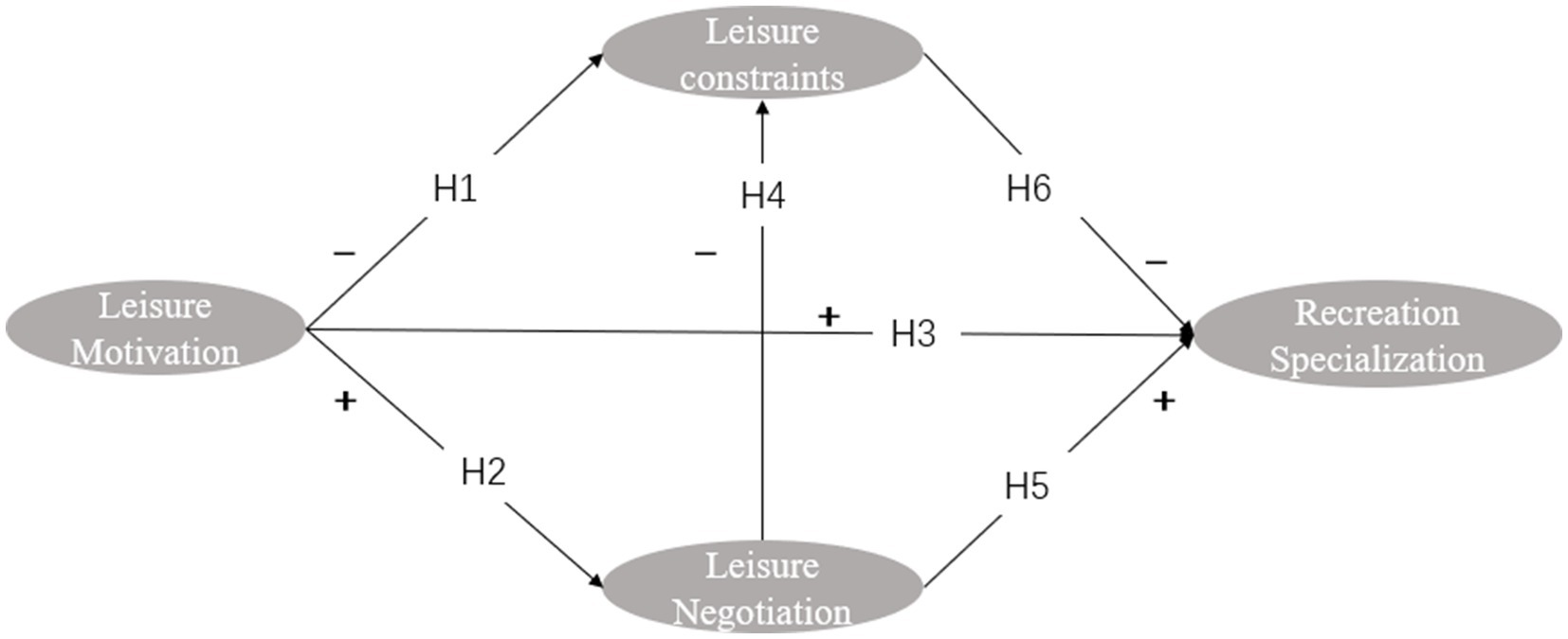 Qiu (2009) claimed that the relationship between motivation and restriction also differs across different stages of the development of recreational sports behavior and that individuals employ different alternative strategies to coordinate the relationship between these two factors. Xie and Ritchie (2019) introduced leisure theory to the study of travel behavior, arguing that strongly motivated groups tend to use negotiation strategies more frequently to facilitate final destination selection and that the main influence of travel motivation on travel intention is indirect, i.e., it is mediated through alternative strategies; in addition, Xie specifically explained that the more travel restrictions individuals encounter, the more likely they are to use negotiation strategies to overcome these restrictions. Hubbard and Mannell (2001) agreed that negotiation has been found to play a mediating role in the mechanism underlying the influence of motivation and participation. Recreation specialization represents a deepening of leisure participation; thus, this study posits that leisure negotiation plays a mediating role in this context, and when it operates as such an intermediary mechanism, leisure motivation and leisure constraints have positive impacts on recreation specialization. Accordingly, the following hypotheses are proposed: