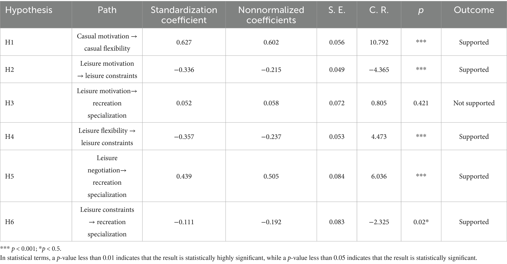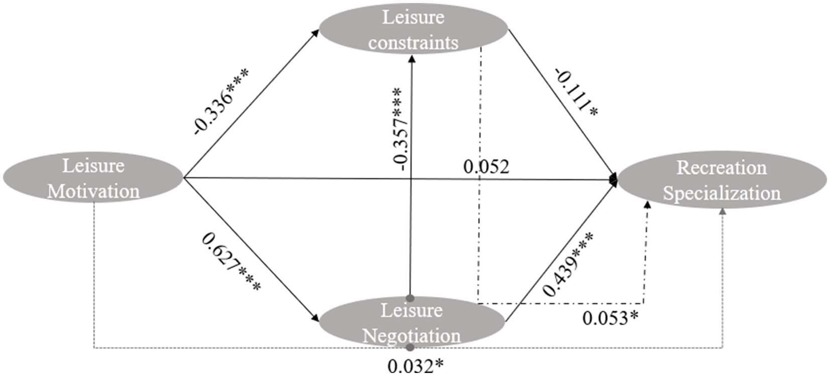 The standardized path coefficients for the structural equation model are shown in Table 2 and Figure 2. Leisure motivation has a negative effect on leisure constraints, and the standardization coefficient is −0.0.072 (p = 0.017). H1: The findings show that the stronger people’s motivation to participate in leisure activities is, the fewer constraints they face. Leisure motivation has a positive effect on leisure negotiation, and the results are significant. The standardization coefficient is high at 0.626 (p<0.001), indicating that driven by high motivation, people engaging in leisure activities are more willing to adopt effective alternative strategies to overcome difficulties, thus supporting H2. However, leisure motivation has no direct effect on recreation specialization, and the normalization coefficient is 0.058 (p = 0.421). This result is not significant, thus rejecting Hypothesis H3. Leisure flexibility has a significant negative impact on leisure constraints, and the standardization coefficient is −0.357 (p < 0.001), thus supporting H4. Leisure negotiation also has a positive effect on recreation specialization, and the standardization coefficient is 0.439 (p < 0.001), indicating that effective workarounds can promote the development of leisure professionals in the direction of specialized leisure, thereby supporting H5. Leisure constraints have a negative impact on recreation specialization, and the standardization coefficient is −0.111 (p = 0.02), illustrating that it is difficult for people engaging in leisure activities to achieve recreation specialization when subject to various constraints. Hypothesis H6 is thus supported.