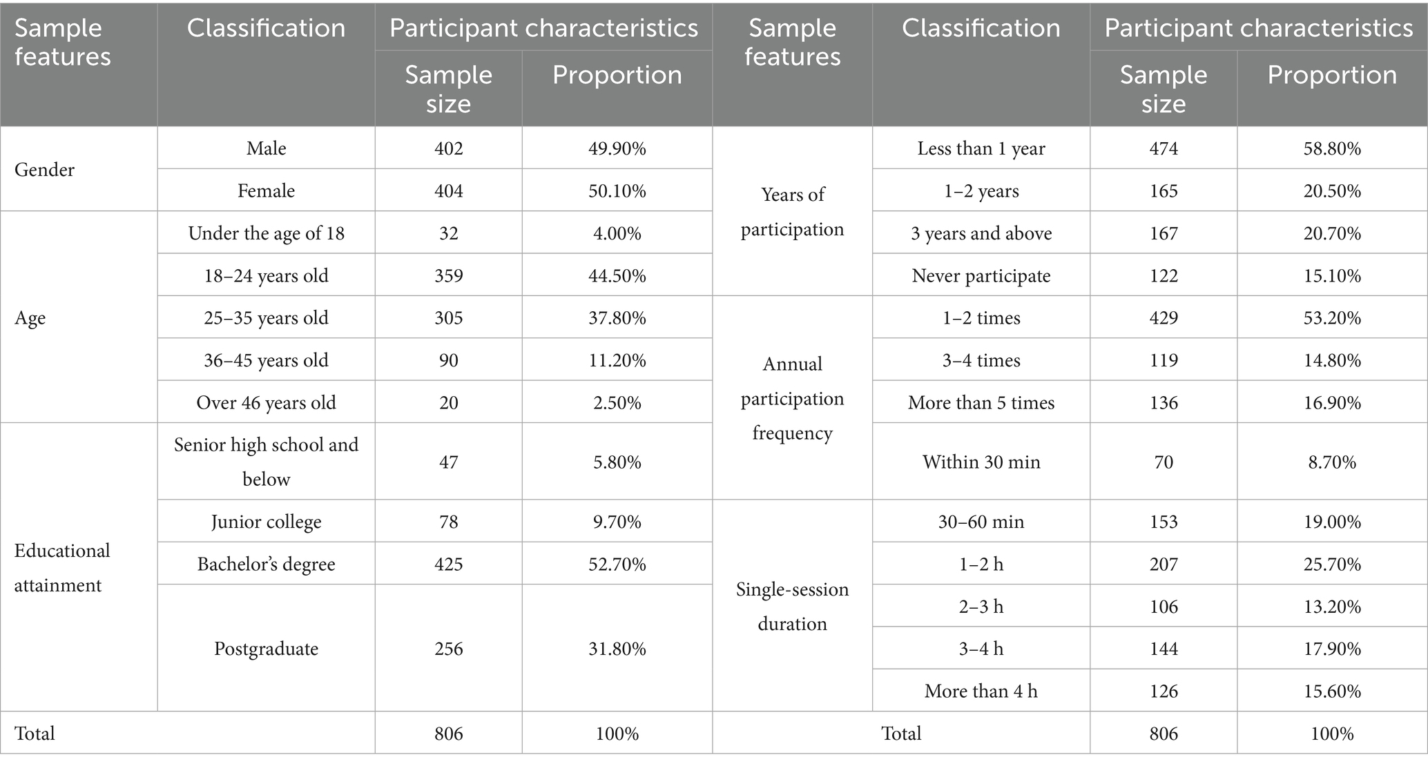 Taking 8 indoor and outdoor skating rinks and 7 ski resorts in Beijing as examples, this study took tourists who were directly involved in ice and snow sports as its target research group and employed a random and convenience sampling method to facilitate the distribution, completion and collection of on-site questionnaires to investigate people participating in ice and snow sports. Between January 3 and 10, 2021, a total of 1,000 questionnaires were distributed, and 914 were collected (from 474 skating rink participants and 440 ski resort guests); the questionnaire recovery rate was 91.4%. After a consistency check, 108 invalid questionnaires were eliminated, and 806 valid questionnaires were retained (including 405 from the skating rink and 401 from the ski resort), for an effective rate of 88.2%. The sample characteristics are shown in Table 1, including those of ice and snow sports participants in terms of gender, age, educational background, years of participation, annual participation frequency, and single-session duration.