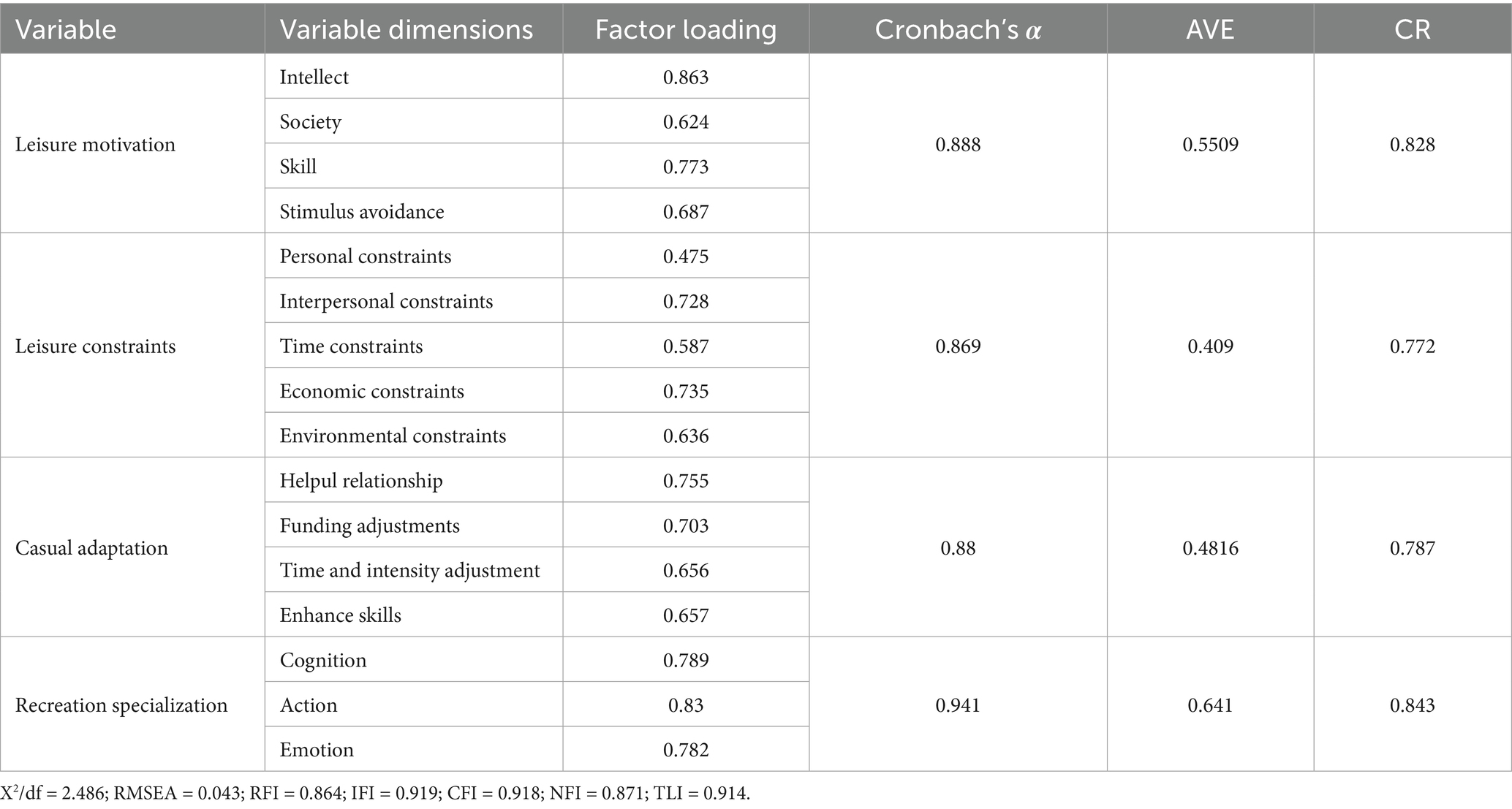 To ensure the validity and scientificity of the data, the questionnaire results were tested using SPSS 26.0 software, and the KMO value was 0.90. The results of each index are shown in Table 1, which indicates that the standardized factor load of all observed variables was greater than 0.6 with exception of the interpersonal constraint dimension in leisure constraints; these findings indicate that the observed variables have high explanatory value. The Cronbach’s α coefficients for the four leisure variables were 0.888 for leisure motivation, 0.869 for leisure constraint, 0.88 for leisure variant, and 0.941 for recreational specialization. The internal consistency of each dimension is thus high, indicating that the data are relatively reliable. The results of confirmatory factor analysis showed that with the exception of the AVE value of the leisure constraint dimension, which was 0.409, the mean variance extraction (AVE) values of the remaining components ranged between 0.481–0.641. The combined reliability (CR) values ranged between 0.771 and 0.842, and the reference standard higher than 0.5 indicated that the convergence validity of the data results was good. The structural validity test of the model was performed using AMOS 26 software, and the overall fit degree test is shown in the table. The chi-square degree of freedom ratio (X2/df) was 2.486, with an approximate root mean square error index (RMSEA) of 0.043; comparative fit index (CFI), canonical fit index (NFI), and Tucker–Lewis index were also calculated. The results of several indicators of index (TLI) were close to 0.9 or greater than 0.9, thus meeting the basic conditions for adaptation.