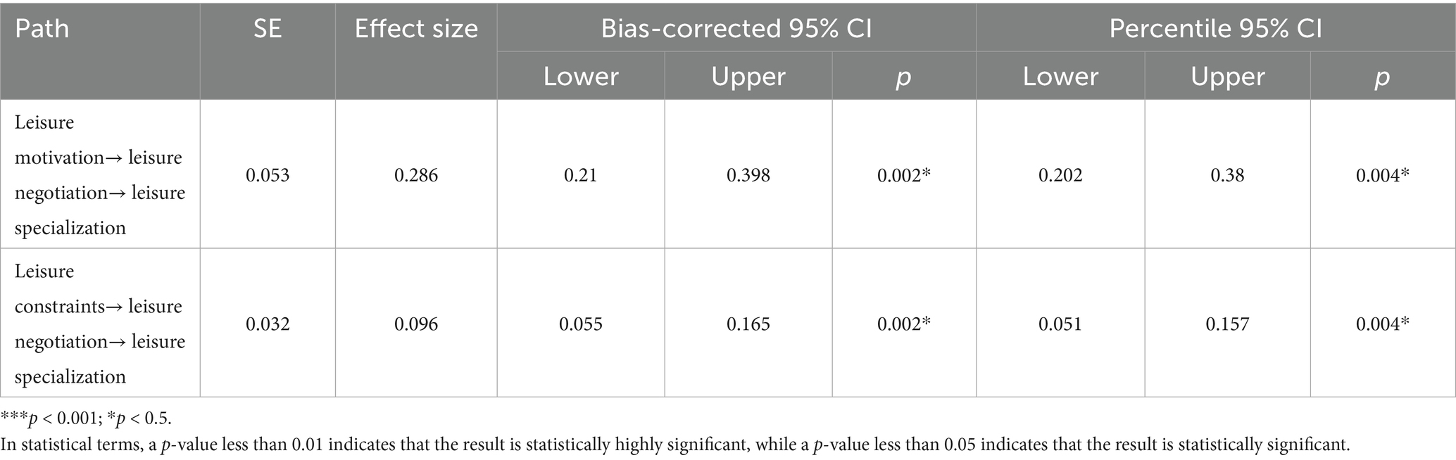 According to the analysis conducted using AMOS 26.0, which featured leisure constraints and leisure negotiation as the mediating variables in the model, as shown in Table 3 and Figure 2, and the analysis of the standardized mediation effect, leisure motivation has a positive impact on leisure specialization at the 95% level. The CI values range from 0.21–0.398 (not including 0), and the direct path shows that leisure motivation has no direct effect on recreation specialization, indicating that leisure negotiation plays a complete mediating role in this process. Leisure constraints have a positive effect on recreation specialization through leisure negotiation, and 95% of the CI values range from 0.055 to 0.165 (not including 0); the results are thus significant. According to the direct path, leisure constraints have no positive impact on recreation specialization, indicating that leisure negotiation also has a complete mediating effect on this path relationship and that when people engaging in leisure activities encounter various constraints, they can address their difficulties and increase the possibility of deep participation through adaptation (Figure 3).