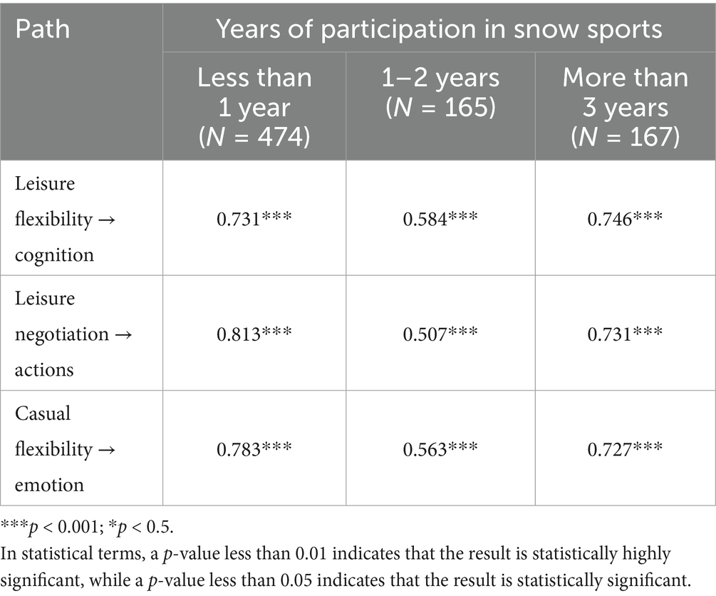 Overall, leisure flexibility has significant positive impacts on cognition, action and emotion in the three groups. Compared with individuals who have participated in ice and snow sports for 1–2 years, the implementation of alternative strategies by beginners in leisure-related activities (i.e., people with less than 1 year of experience) and people with more than 3 years of experience has a more significant impact on the path of recreation specialization. The specific conceptual path indicates that the alternative strategy effectively improves the “cognition” of recreation specialization, and the coefficients of participants with less than 1 year or more than 3 years of experience were higher than 0.7. The specific effectiveness coefficient with respect to “action” was the highest among participants with less than 1 year of experience, followed by participants with more than 3 years of experience, indicating that strategy implementation can effectively promote the actual participation of people in leisure activities. Similarly, the “emotional” conceptions of participants with less than 1 year of experience is also affected by the workaround, and this influence is greater than that exhibited by participants with more experience (Table 5).