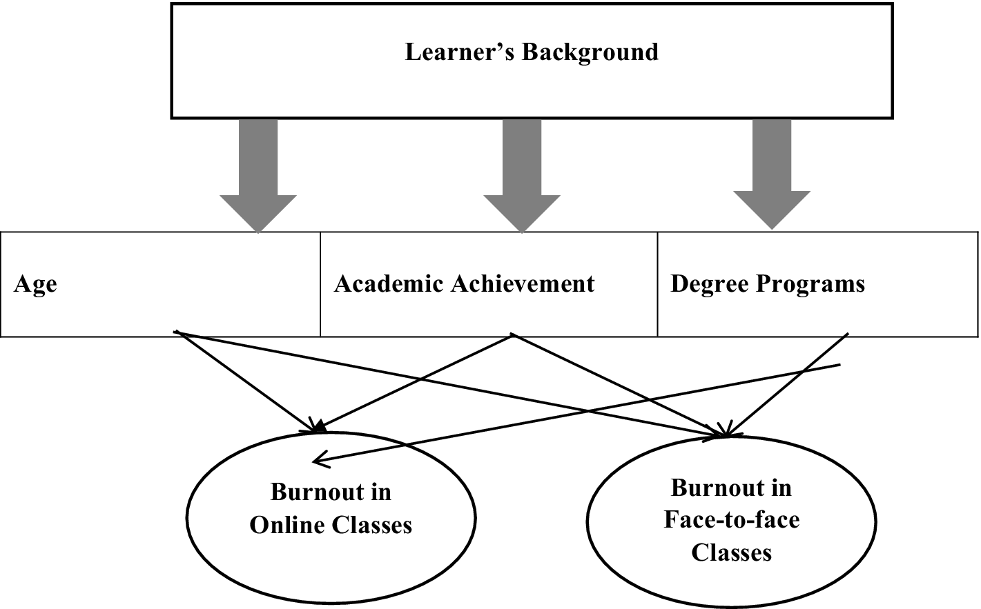 This study is intended to develop a conceptual model of factors that affect academic burnout in online vs. face-to-face classes, as reported by the study’s participants. Different factors may influence the factors above; this study includes age, academic achievement, and degree programs. These factors are believed to impact learners’ academic burnout in different educational settings. The conceptual framework of the study is shown in Figure 1 below.
