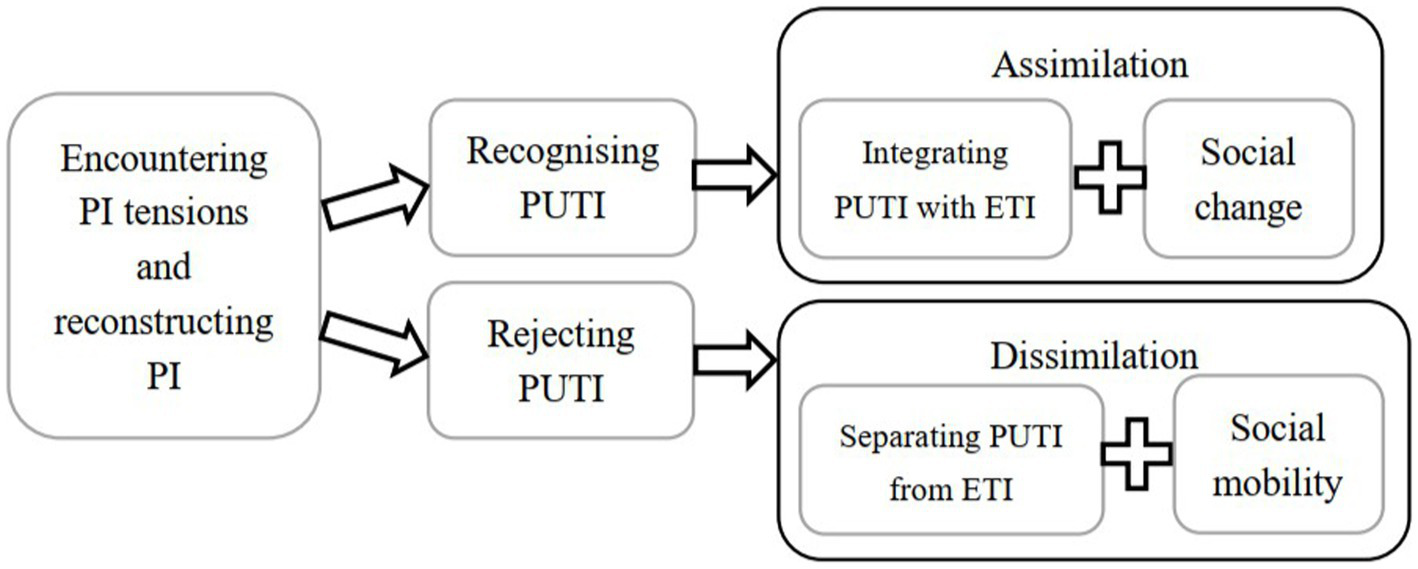 PI tension or crisis is a common phenomenon among highly accomplished academics such as university teachers who feel a lack of social recognition and belongingness, a sense of incompetence (Vaughn et al., 2020), and doubt many components of their PIs (self-image, teaching competence, attitude, teaching beliefs and values, future expectations of career) (Bolívar et al., 2014). Multiple self-concepts are incompatible within their PIs and they have difficulty reconciliating diverse demands, values, and goals embedded in the commitment to those concepts (Baumeister et al., 1985). Afterward, they negotiate and reconcile their multiple roles by varied forms of participation and sense making of the membership of different professional communities (Hodgen and Askew, 2007). Ghiasvand et al. (2023) mapped novice and experienced Iranian EFL teachers’ PI conflicts and confrontation strategies. Through semi-structured interviews and narrative frames with 30 EFL teachers, they found that both novice and experienced teachers faced identity conflicts due to factors like teaching philosophy mismatch, with different sources of conflict for each group, and suggested various confrontation strategies.