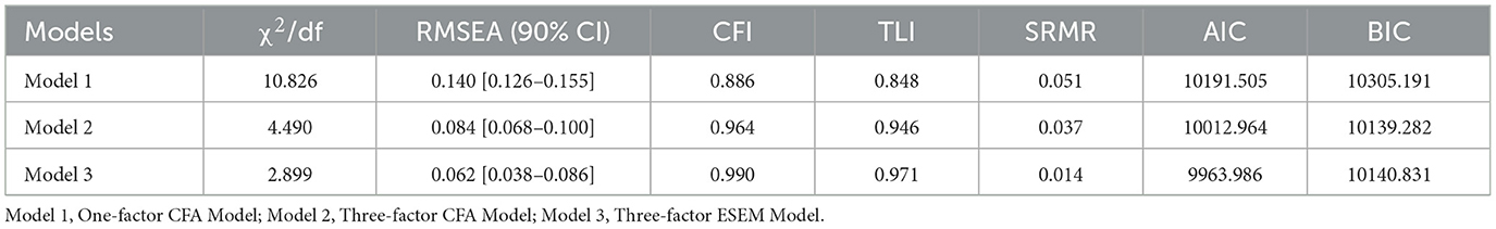 In contrast, the three-factor CFA model (Model 2) exhibited markedly improved fit statistics: χ2/df = 4.490, RMSEA = 0.084 [90% CI (0.068–0.100)], CFI = 0.964, TLI = 0.946, and SRMR = 0.037. The information criteria showed improvement with AIC = 10012.964 and BIC = 10139.282. While representing a considerable enhancement over the unidimensional structure, several indices remained marginally acceptable, suggesting potential model misspecification.