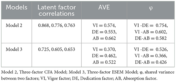 The AVE values for the CFA model were: Vigor = 0.574, Dedication = 0.553, and Absorption = 0.662. The shared variance (φ) between factors ranged from 0.582 to 0.754. Specifically, the shared variance between Vigor and Dedication (0.754) exceeded both factors' AVE values, and the shared variance between Dedication and Absorption (0.582) exceeded Dedication's AVE (0.553). However, the shared variance between Vigor and Absorption (0.602) did not exceed Absorption's AVE (0.662) but was comparable to Vigor's AVE (0.574). This pattern suggests inadequate factor distinctiveness, particularly between Vigor-Dedication and Dedication-Absorption factor pairs. The results have implications for whether these dimensions should be treated as separate scores or potentially merged in research.