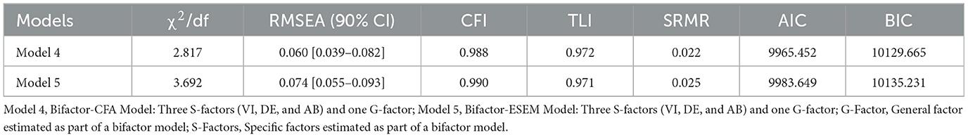 In contrast, the bifactor-ESEM model (Model 5) demonstrated both acceptable fit statistics: χ2/df = 3.692, RMSEA = 0.074 [90% CI (0.055–0.093)], CFI = 0.990, TLI = 0.971, and SRMR = 0.025, with AIC = 9983.649 and BIC = 10135.231, and theoretically plausible parameter estimates.
