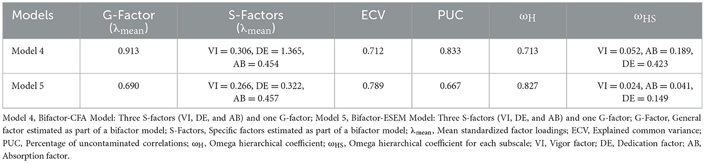 Given the convergence issues with the bifactor-CFA model (Model 4), interpretation focuses primarily on the bifactor-ESEM model (Model 5). This model presented theoretically acceptable parameter estimates (Table 4), with a general factor loading of λmean = 0.690 and balanced specific factor loadings: Vigor (λmean = 0.266), Dedication (λmean = 0.322), and Absorption (λmean = 0.457). The explained common variance (ECV = 0.789) indicated that the general factor accounted for ~79% of the common variance among items, suggesting strong evidence for a general engagement factor.
