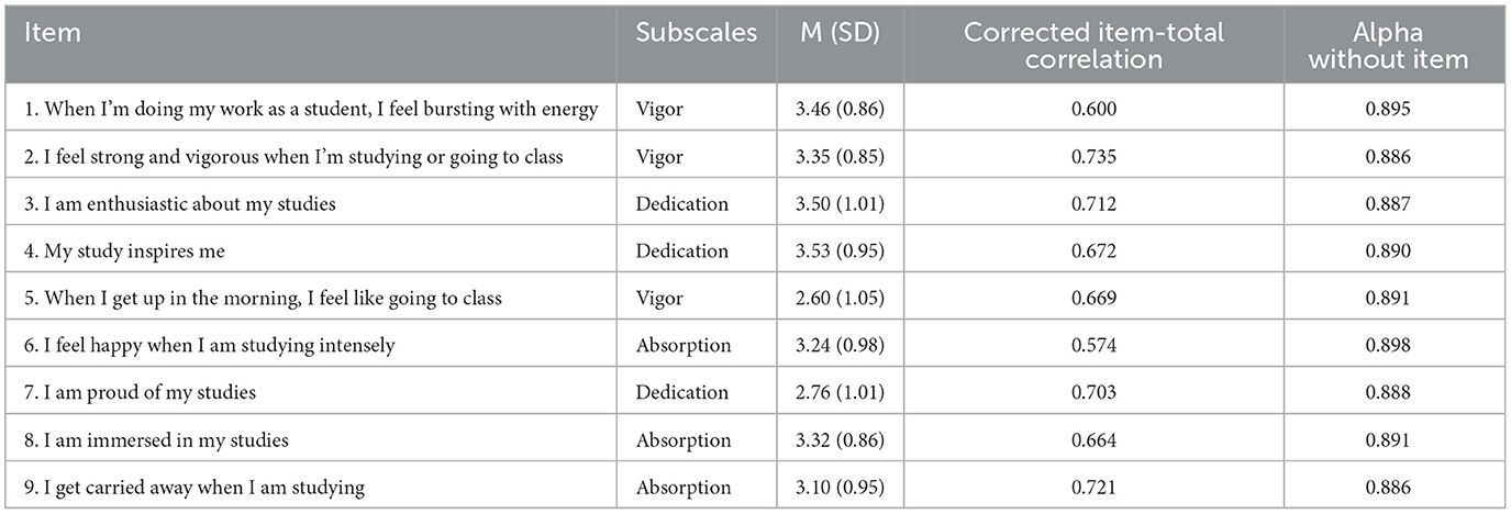 As shown in Table 5, all item-corrected total correlations exceeded 0.50, providing additional descriptive support for internal consistency. Although Cronbach's alpha assumes tau-equivalence and may either underestimate or overestimate reliability when this assumption is violated, the UWES-S-9 demonstrated a high alpha coefficient in this study (α = 0.901), indicating strong internal consistency. “Alpha if item deleted” analyses also yielded consistently high values ranging from 0.886 to 0.898, suggesting that removing any single item would not improve reliability. These results, while interpreted with caution, are consistent with the omega-based findings and further suggest that the scale has good internal consistency.
