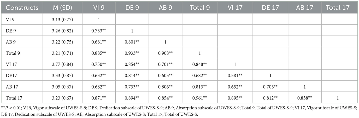 The results revealed a strong positive correlation between the UWES-S-9 and the original UWES-S-17 (r = 0.961; p < 0.01), indicating substantial agreement between the two versions. As detailed in Table 6, each subconstruct of the UWES-S-9 demonstrated robust correlations with its corresponding subconstruct in the original UWES-S-17. Specifically, the Vigor subconstructs showed a significant positive relationship (r = 0.750; p < 0.01), as did the Dedication subconstructs (r = 0.814; p < 0.01) and the Absorption subconstructs (r = 0.806; p < 0.01). These findings provide robust evidence of the scale equivalence with the UWES-S-17, supporting its capacity to measure the same theoretical constructs as the original scale in a more concise format.